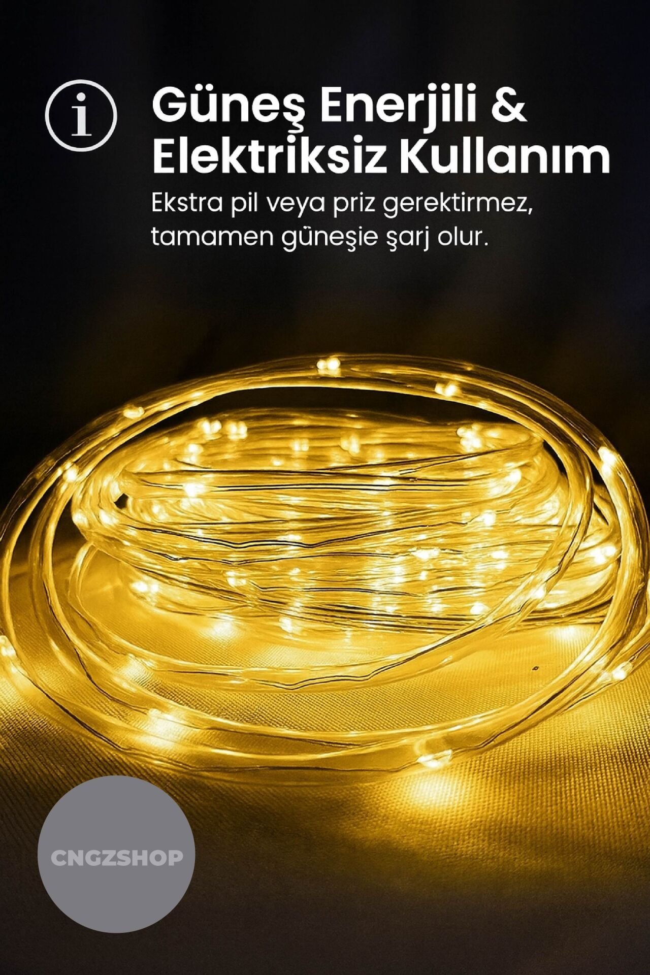 100 LED 12 Metre Sarı Solar Peri Led Işık | Güneş Enerjili Su Geçirmez Bahçe, Balkon, Ağaç ve Yılbaşı Aydınlatması