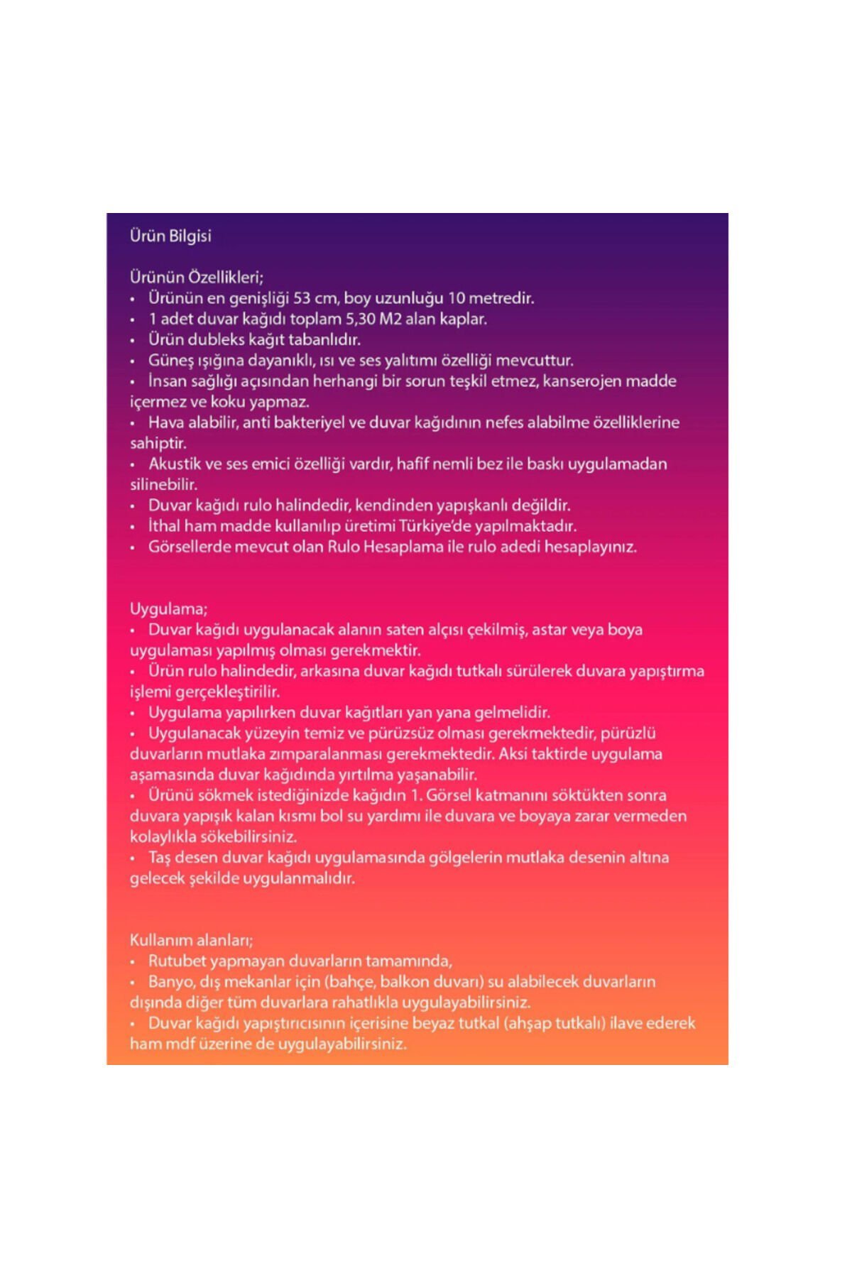 Rulonun ölçüleri: Eni : 52 cm boyu 10,00 metre 1 rulo 5,33 m'2 alan kaplar Leke ve kir tutmaz. ; Hava alabilir duvar kağıtlarının güneş ışığına dayanıklılığı vardır hiçbir şekilde solmaz. ; %100 oranında silinebilir hijyeniktir insan sağlığı açısından her hangi bir sorun teşkil etmez. ; Sağlıklı ve doğaldır anti bakteriyel nefes alabilen özelliklere sahiptir. ; Akustik ve ses emici özelliği vardır. ; Kanserojen madde içermez ve koku yapmaz uygulama yerine yapıldıktan sonra kesinlikle ek yerleri belli olmaz ; Lekeler kolaylıkla çıkabilmektedir ; Kullanım süresi uzundur üretimleri renk ve desen baskısı yapılan birinci hamur kağıttan yapılmıştır. ; Ürün desen takiplidir, sipariş verirken göz önünde bulundurmanız gerekir. ; Kendinden yapışkanlı değildir. ;