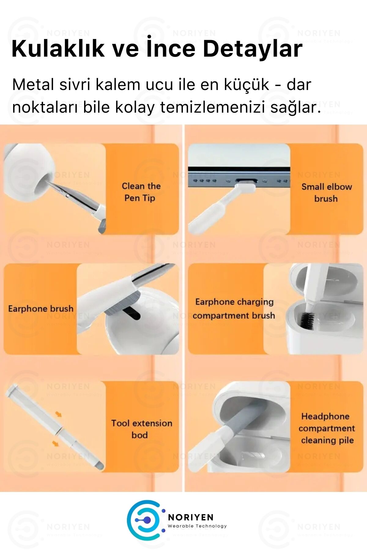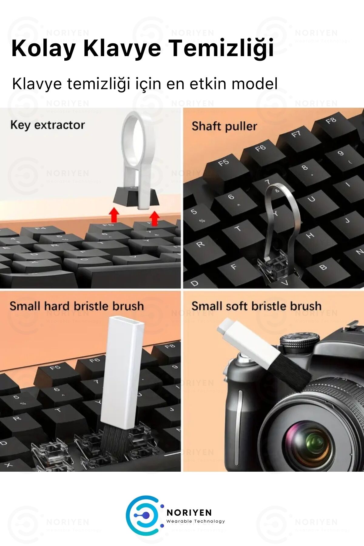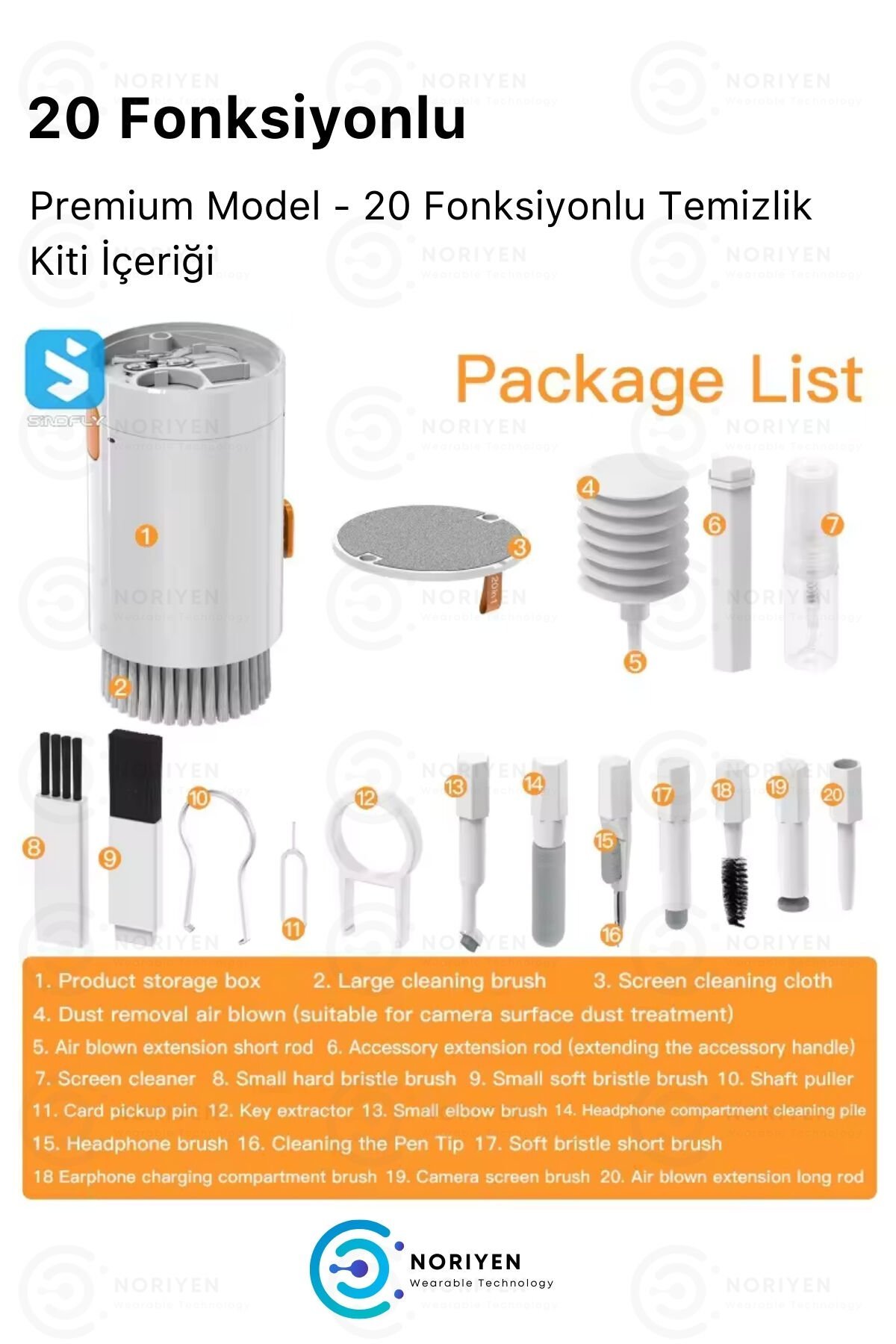 Noriyen kalitesiyle Yeni Nesil 20in1 Premium Cleaning Temizleme Kiti ; 20in1 - Çok Fonksiyonlu ; Premium Kullanışlı Model ; Yıkanabilir özel yapısı ile zaman içinde kullanılmaz hale gelen temizlik kitlerinden çok üstün bir deneyim sunar.; ; Mikrofiber bezli kapak tasarımı ile telefon - tablet ve geniş yüzeyli tüm ekranları temizleyebilirsiniz.; ; Düğmeli açılır kapanır kapağıyla tüm aparatları kolayca toplanabilir.; ; Alt kısmında büyük fırça aparatı ile geniş yüzeyler kolayca temizlenir.; ; Bu seriye özel bulunan hava pompası sayesinde kamera lensini çizmeden temizleyebilirsiniz.; ; Metal sivri kalem ucu ile en küçük - dar noktaları bile kolay temizlemenizi sağlar.; ; Klavye tuşu çıkarma aparatı ile klavye temizliği ; 20in1 MULTIFUNCTION İÇERİĞİ: ; 1. Ürün depolama kutusu ; 2. Büyük temizlik fırçası ; 3. Mikrofiber bezli ekran temizleme kapağı ; 4. Toz giderme hava pompaso (Kamera yüzeyi için uygun) ; 5. Hava üfleme pompası için uzatma kısa çubuk ; 6. Aksesuar uzatma çubuk (Aksesuar kolunu genişletmek için) ; 7. Ekran temizleyici sprey ; 8. Kücük sert kıl fırça ; 9. Kücük yumuşak fırça ; 10. Mil çıkartma aparatı ; 11. Sim kart iğnesi ; 12. Klavye tuş çıkartma aparatı ; 13. Küçük dirsek fırçası ; 14. Kulaklık kutusu temizleme fırçası ; 15. Kulaklık fırçası ; 16. Metal kalem tipi temizleme aparatı ; 17. Yumuşak kıllı kısa fırça ; 18. Kulaklık sarj bölmesi fırçası ; 19. Kamera ekranı temizleme fırçası ; 20. Hava üfleme pompası için uzatma uzun çubuk ; En çok tercih edilen Elektronik ürünler için Noriyen mağazasını ziyaret edebilirsiniz.