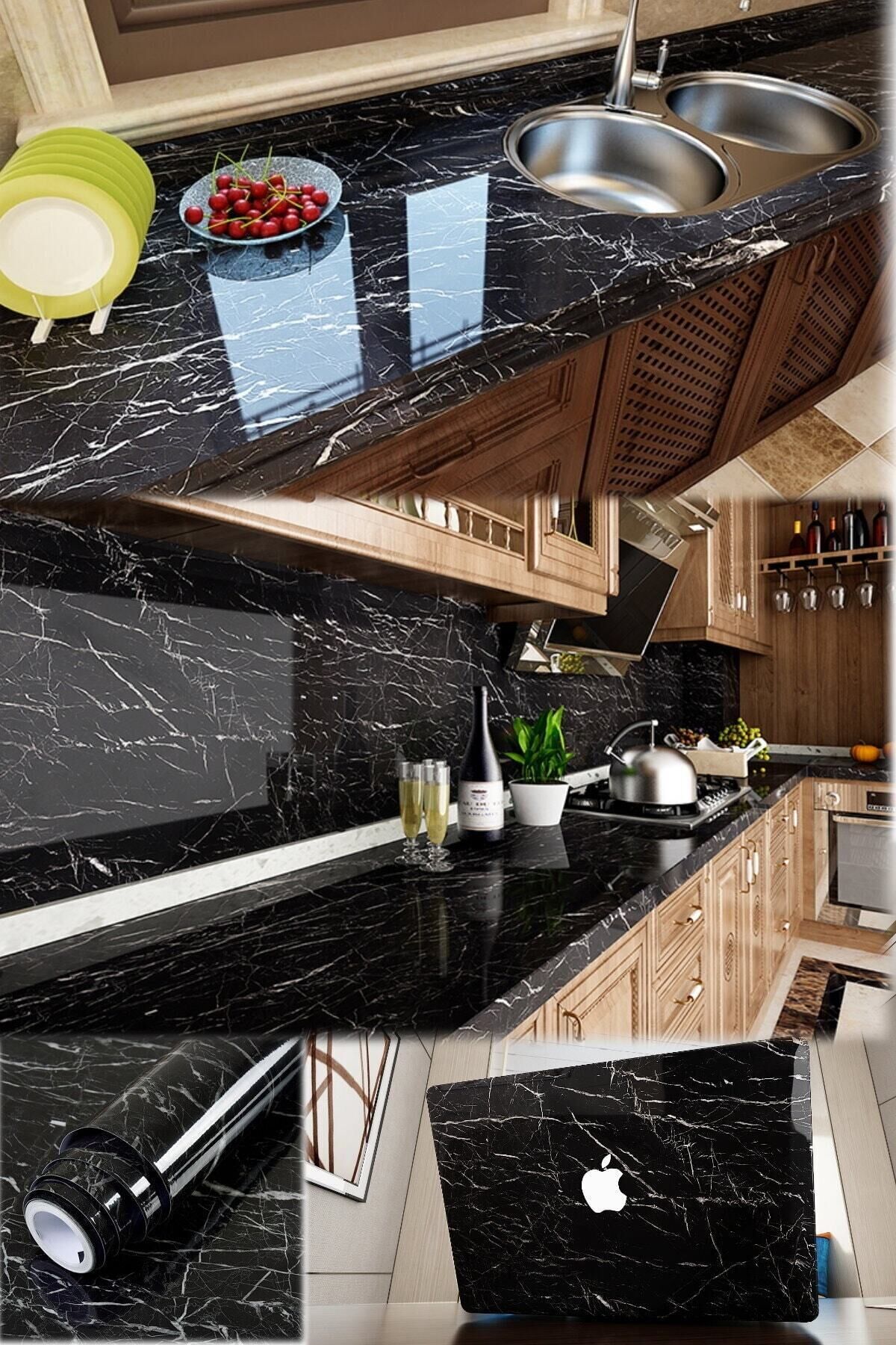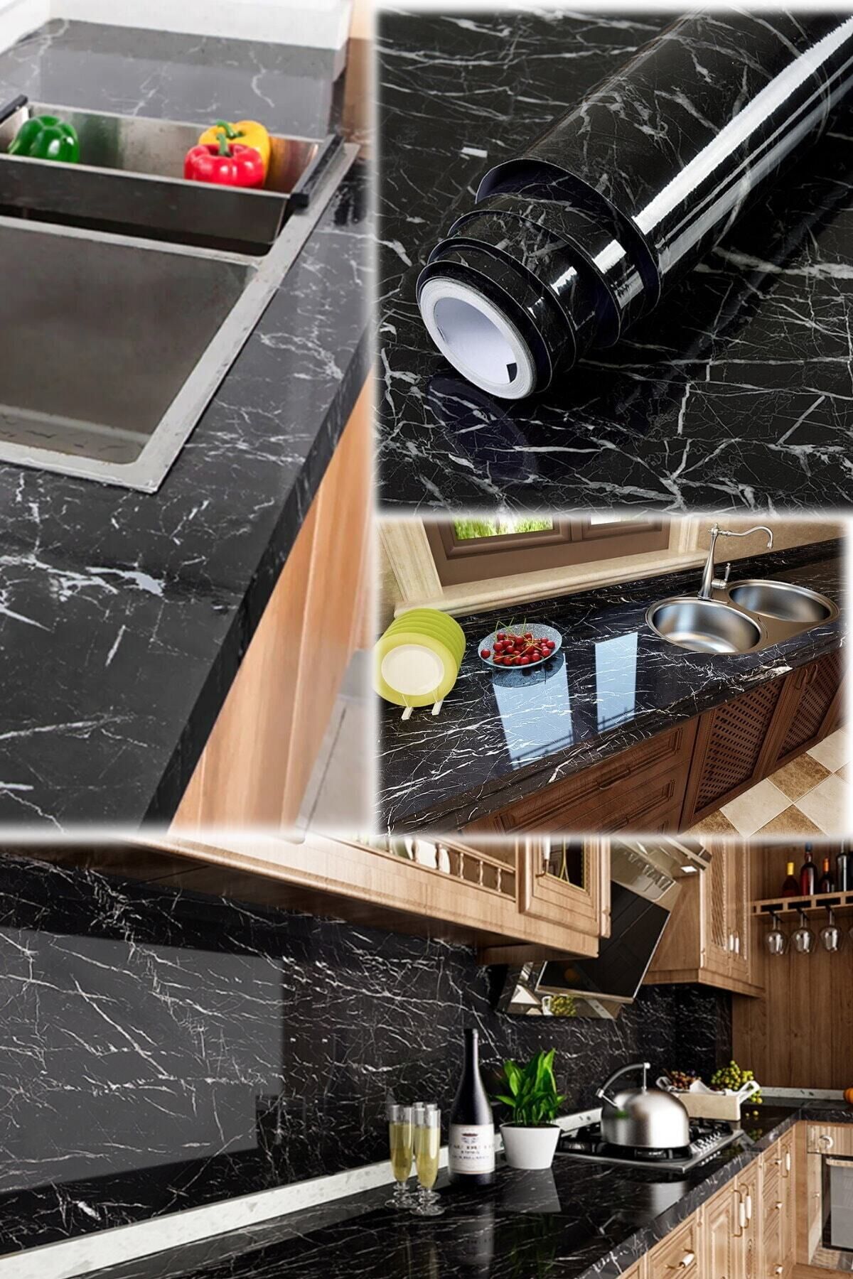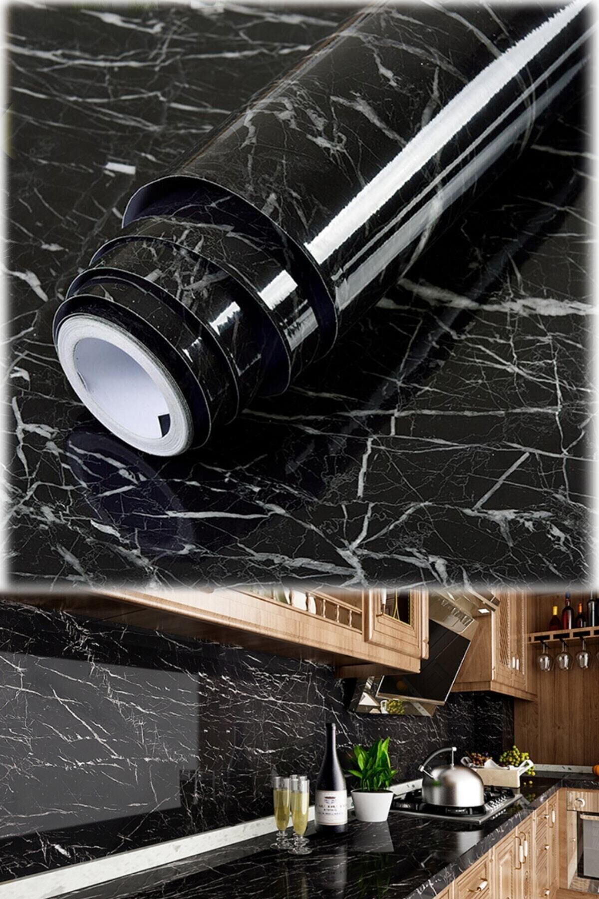 5 Metre X 60 Cm Mermer Folyo Kaplama Kağıdı Siyah Yapışkanlı Mermer Görünüm Masa Tezgah Dolap Mutfak