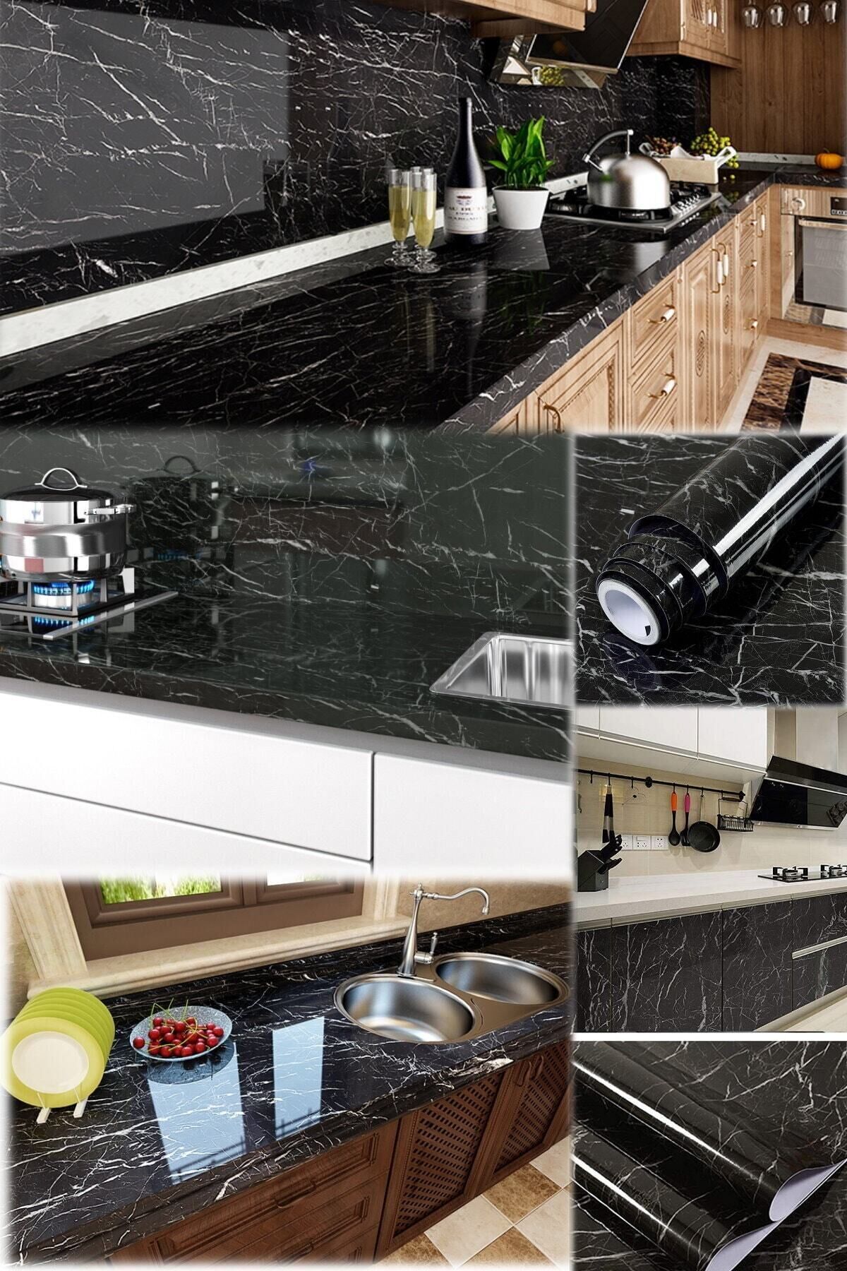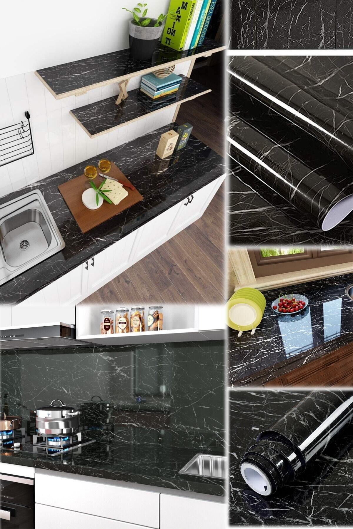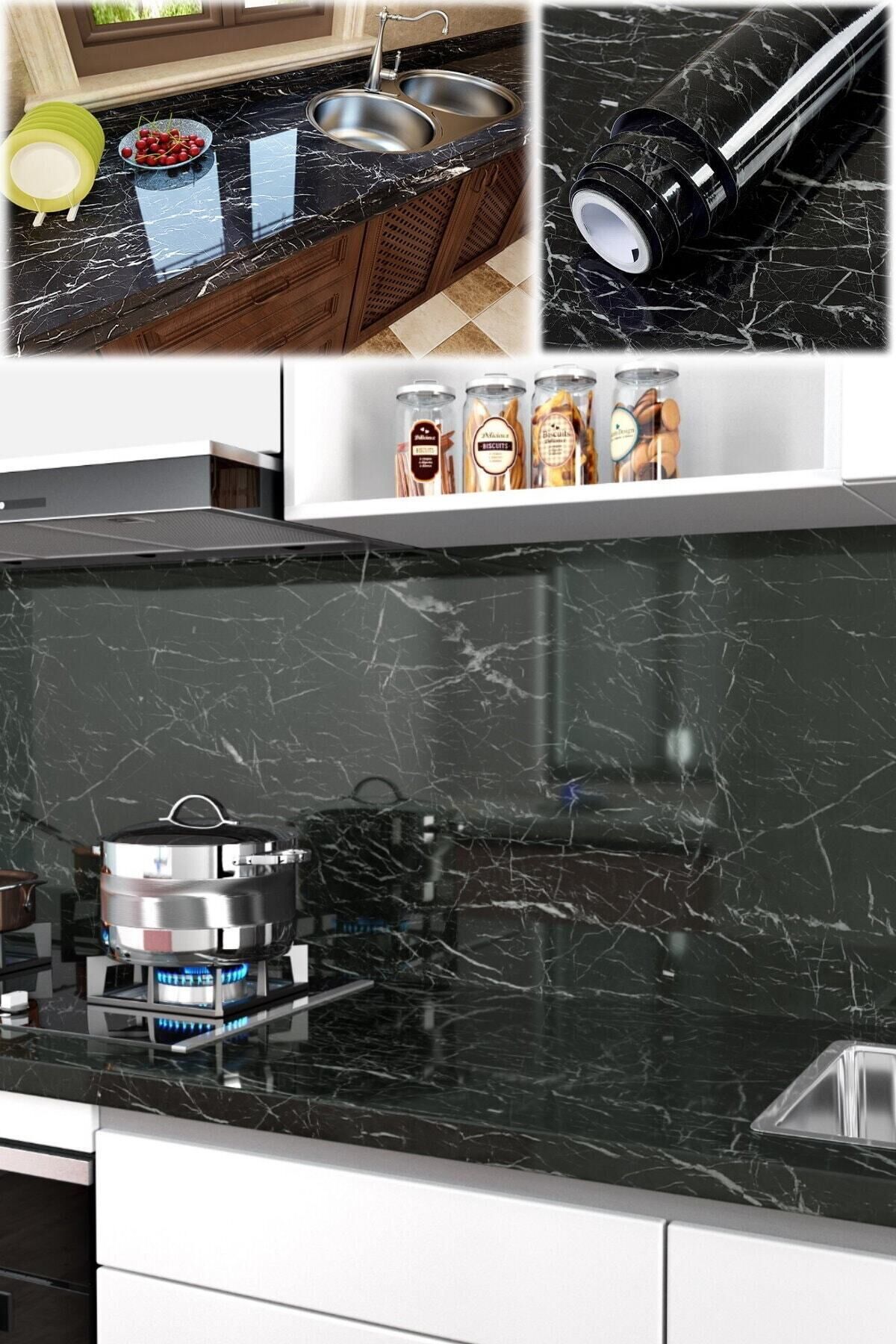 5 Metre X 60 Cm Mermer Folyo Kaplama Kağıdı Siyah Yapışkanlı Mermer Görünüm Masa Tezgah Dolap Mutfak