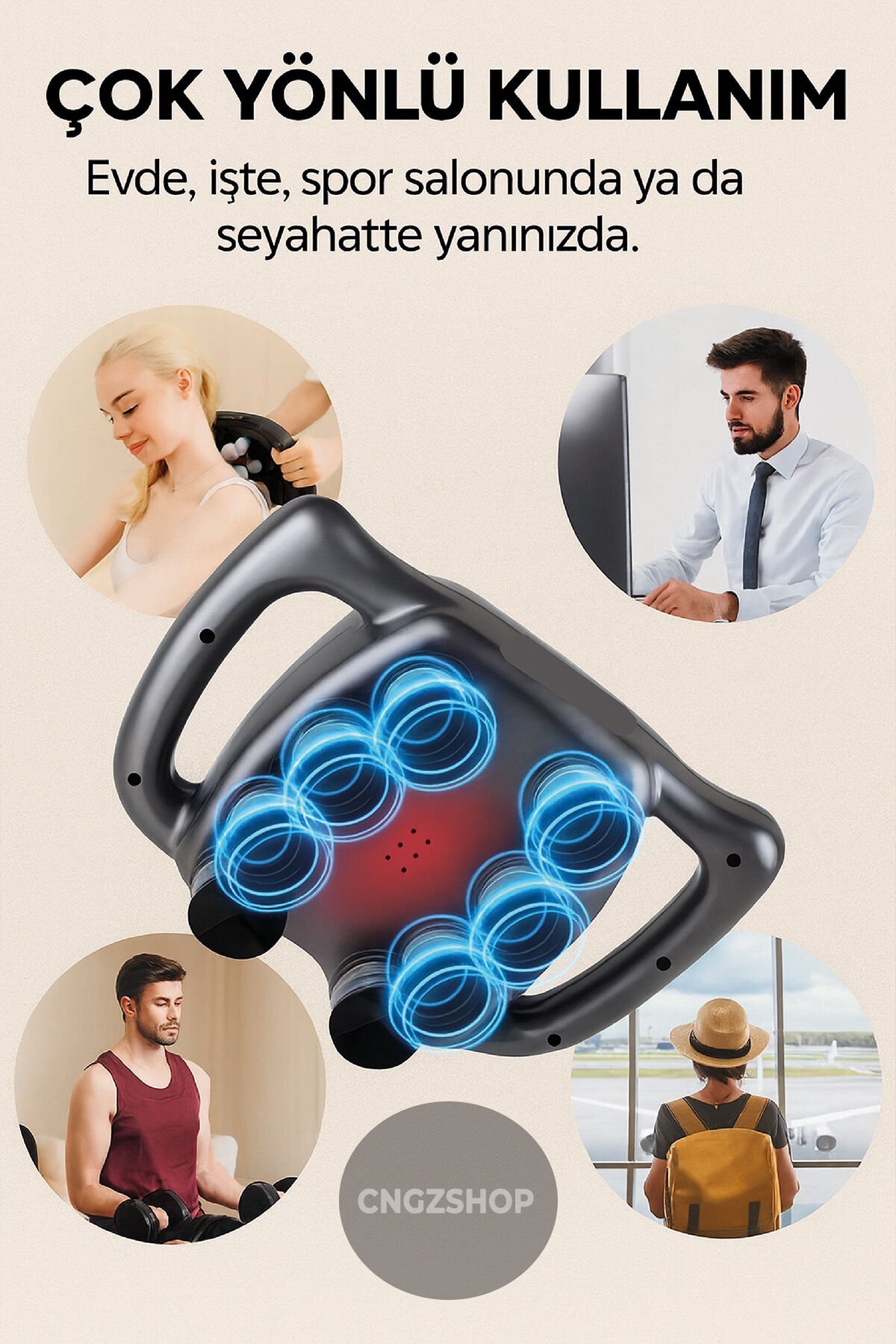 8 farklı başlık sayesinde farklı kas gruplarına özel masaj imkanı sunar. Derin doku masajı, gevşeme, kas rahatlatma ve dolaşım destekleme gibi etkiler sağlar. Isıtmalı fonksiyonu kasların daha hızlı gevşemesine yardımcı olurken, şarjlı yapısı sayesinde kablo derdi olmadan her yerde kullanılabilir.