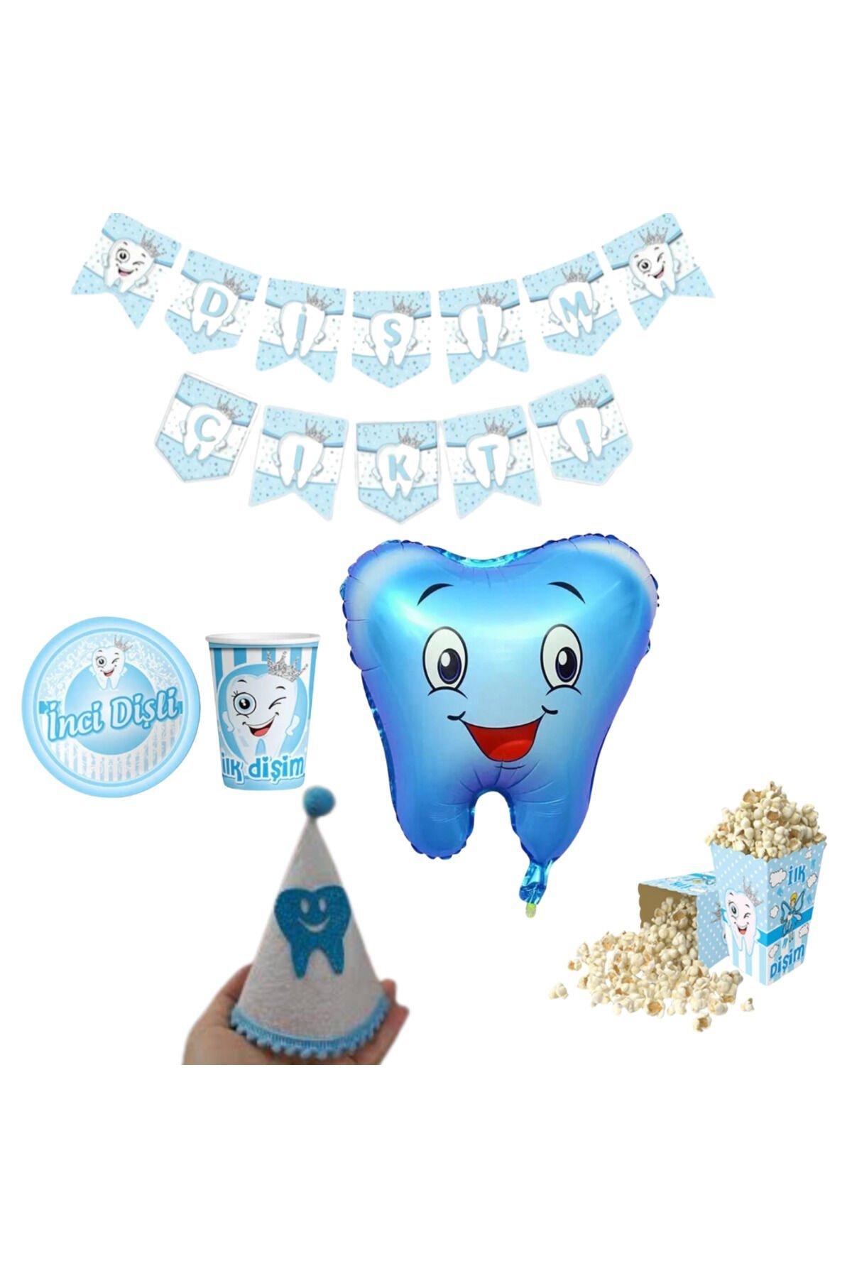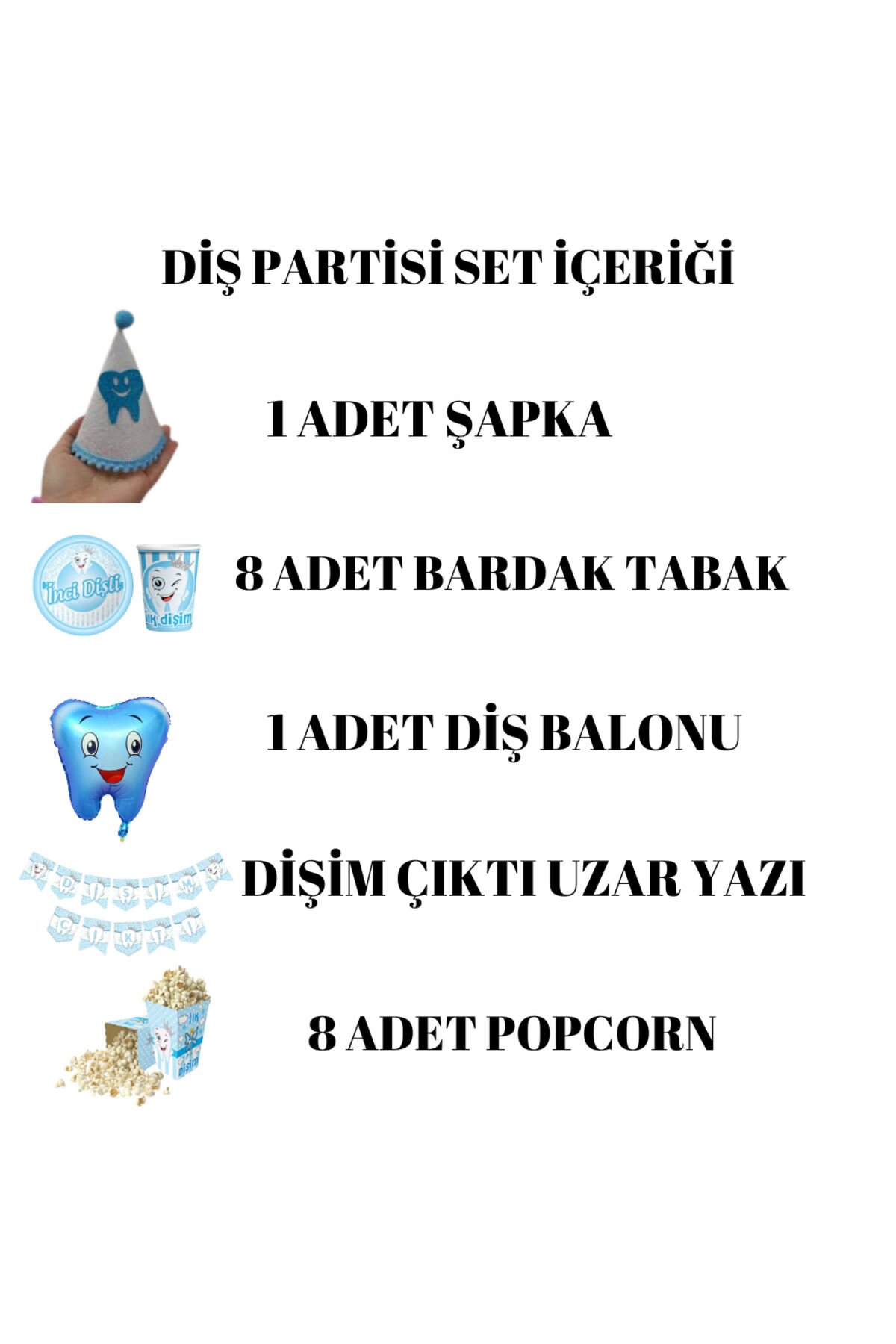 SET İÇERİĞİ; DİŞİM ÇIKTI ŞAPKA 1 ADET DİŞİM ÇIKTI BANNER UZAR YAZI 1 ADET 8 ADET DİŞİM ÇIKTI BARDAK VE TABAK SET 8 ADET İLK DİŞİM ÇIKTI POPCORN MISIR KUTUSU DİŞİM ÇIKTI FOLYO BALONU