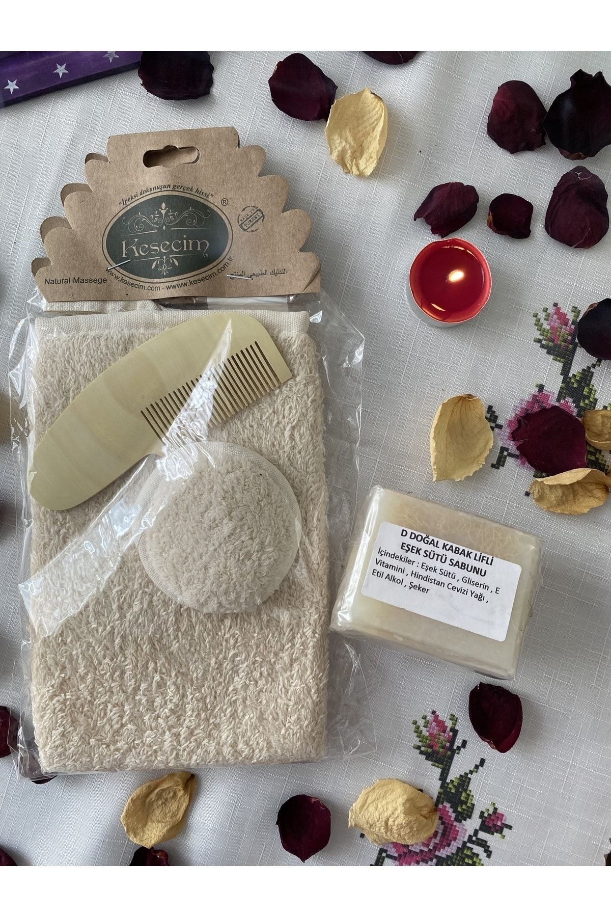 91-) Doğal Bebek Vücut Ve Yüz Banyo Kesesi Tarak Seti %100 Doğal Kabak Lifli Eşek Sütü Sabunu