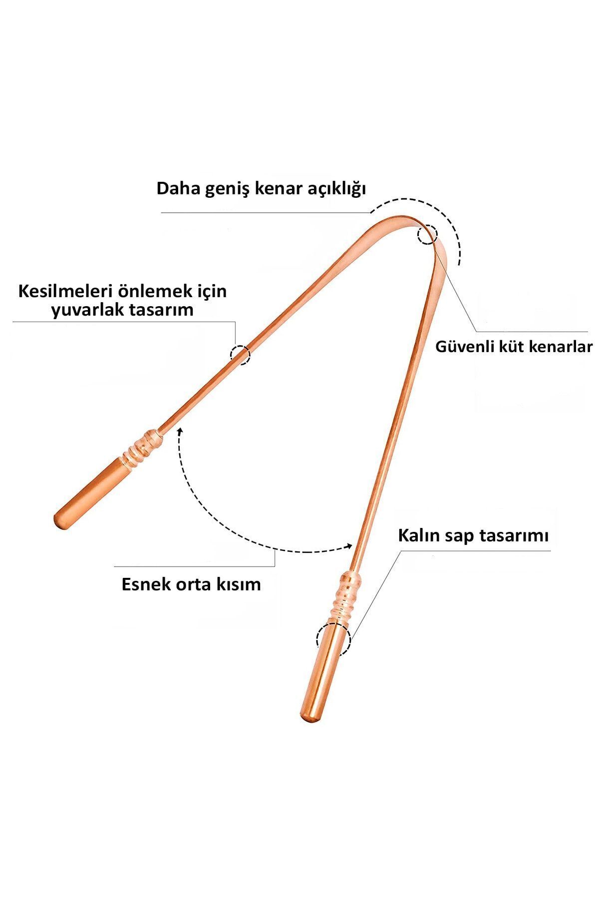 %100 Bakır malzemeden üretilmiştir; Paslanmaz; Oksitlenmez; Anti alerjik; Antimikrobiyal; Mikrop ve bakteri tutmaz; Sağlam elastikiyet yapısı sayesinde uzun yıllar kullanabilirsin; yapısı sayesinde uzun yıllar kullanabilirsiniz; Özel oval kenarlar sayesinde diline ve damağına zarar vermeden güvenle kullanabilirsin; Geniş orta yapısı sayesinde daha etkili bir kullanım olanağı sağlar; Dil temizleyicilerimiz, dil yüzeyinde oluşan mantarları, ölü hücreleri, bakterileri ve plakları temizlemek için tasarlanmıştır; Temizleyicinin orta bölümünü dilinin arka tarafına doğru yerleştir ve hafifçe bastırarak öne doğru çek; Bu işlemi 8 ila 10 kere yapınız;