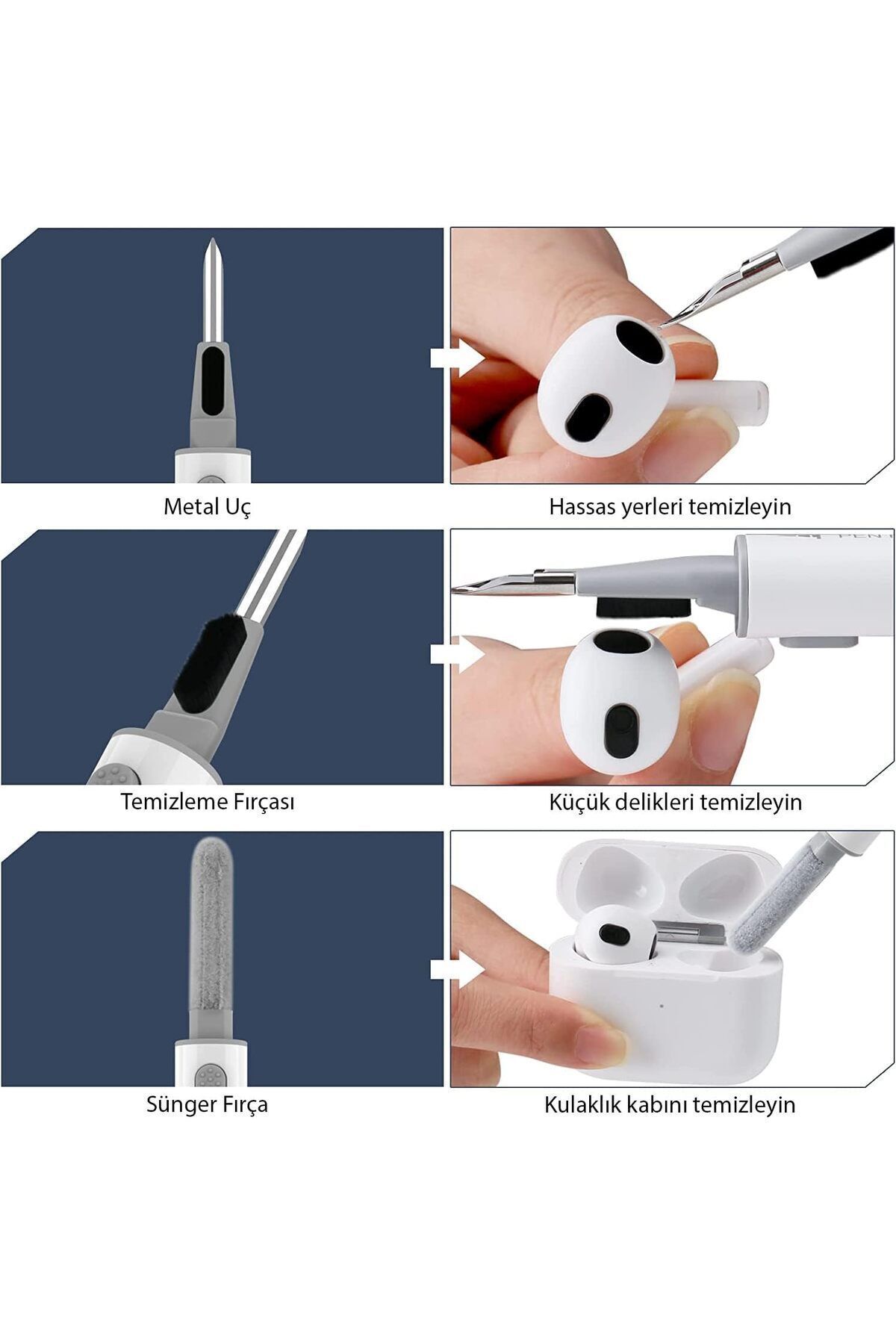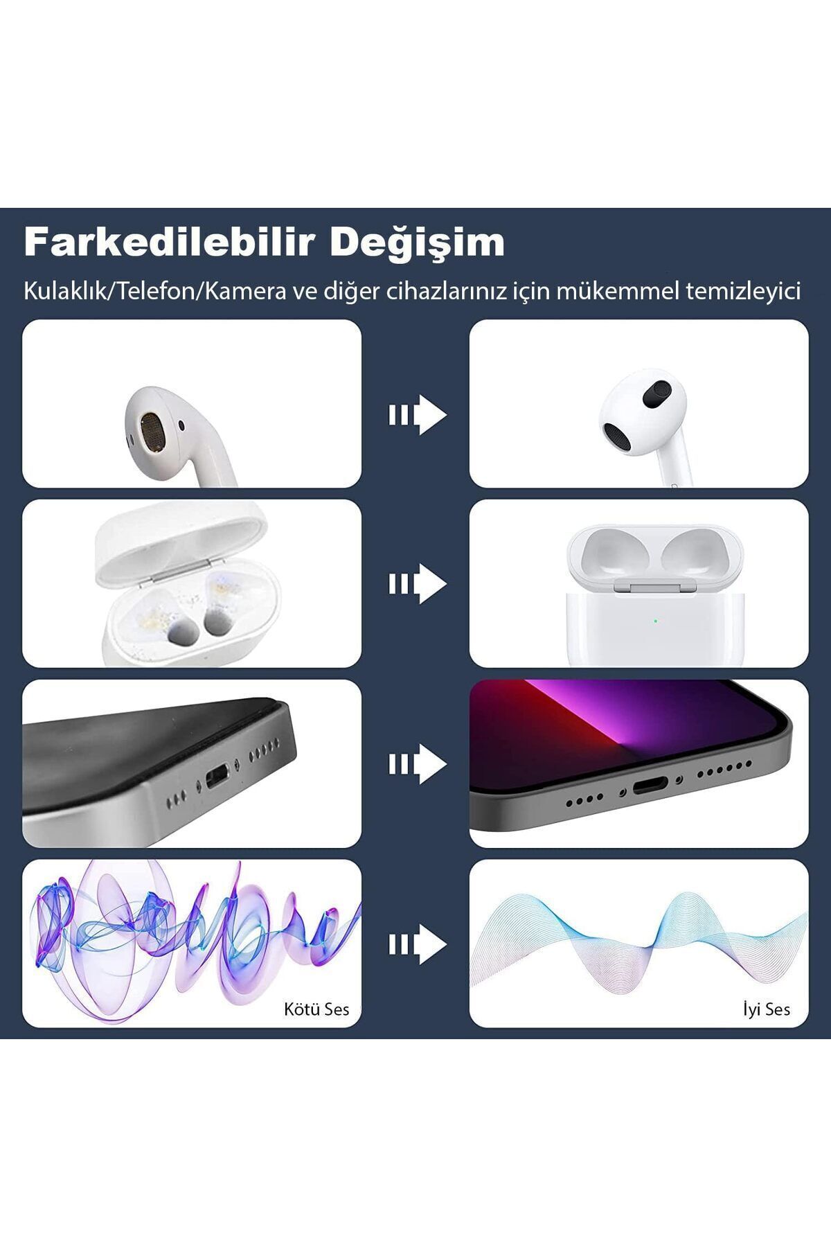 ?Tüm Cihazlarla Uyumlu?Kulaklıklarınızı, telefonunuzu, akıllı saatinizi ve aklınıza gelebilecek birçok elektronik aleti temizleyebilirsiniz. ; ?Tüm Kulaklıklarla Uyumlu?Tüm kulaklıklar ile uyumludur. Tüm kulaklıkları temizleyebilirsiniz. ; ?Küçük Delikler İçin Muhteşem Temizlik?Sadece kulaklık değil, telefonunuza giren tozları, kameranızın küçük deliklerine giren tozları vs. rahatlıkla temizleyebilirsiniz. ; ?3'ü 1 Arada Derinlemesine Temizlik?Ergonomik tasarımı ile rahatlıkla kullanabileceksiniz. İki yönlü bastırıp itmeli tasarımı sayesinde kompakt bir şekilde kullanabilirsiniz. Bir tarafında güçlü sünger fırça , diğer tarafında temizleme fırçası ve metal uç ile eşsiz temizliğe ulaşabilirsiniz. ;