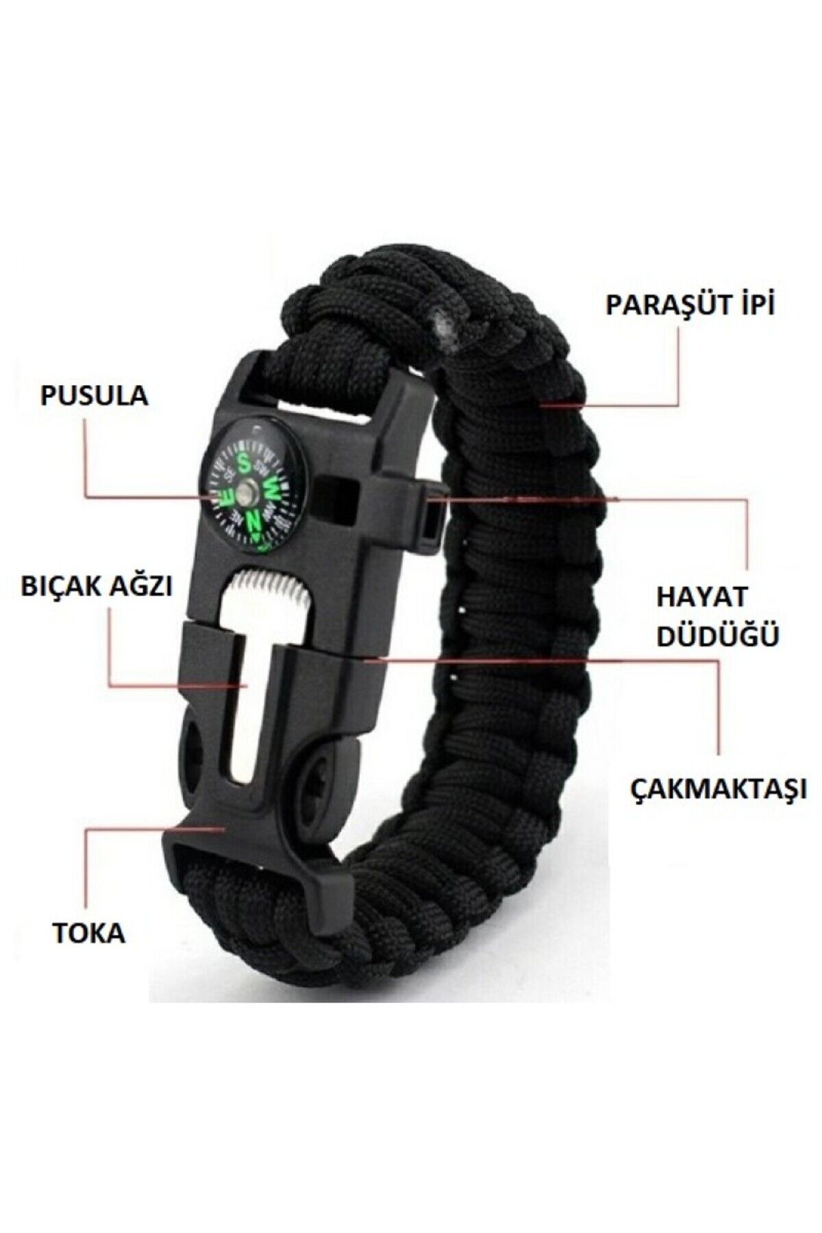 ÇOK AMAÇLI HAYATTA KALMA BİLEKLİĞİ Bileklik günlük hayatta dekorasyon olarak rahatça kullanılabilir. Bileklik hayat kurtarıcı, acil bir durumda kullanılabilen düdük, çakı, çakmaktaşı, pusula ve paraşüt ipi olarak kullanıma uygundur. Kamp, botla, av, yürüyüş vb. Için harika. Bu ip, çok fazla güç ve dayanıklılık gerektiren her şey için kullanılabilir. Paket İçeriği 1 adet çok amaçlı hayatta kalma bilekliği
