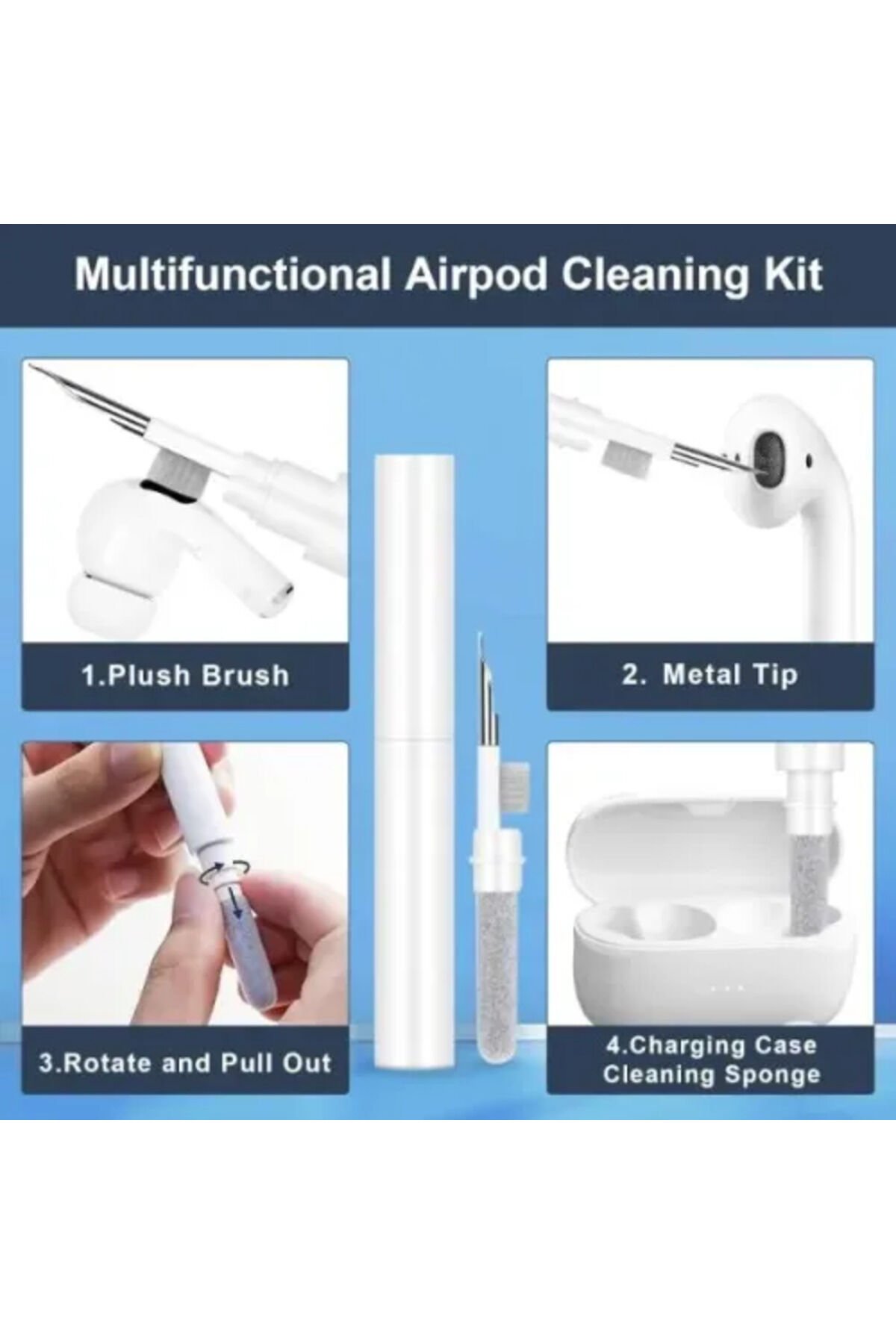 ÇOK AMAÇLI KULAKLIK TEMİZLEME KİTİÜrün ÖzellikleriBu 3'ü 1 arada kulaklık temizleme kalemi, taşınabilir bir temizleme kaleminde üç fonksiyonu birleştirir. Kulak tıkacının küçük parçalarını ve deliklerini temizlemek için bir tarafı değiştirin, diğer taraf şarj kulaklık kutusu bölmesini temizleyebilir.Hafif, taşınabilir ve pratiktir.Taşınabilir olup, toz ve kiri temizler. Her yere kolayca taşınabilir, çantanıza ve cebinize bile koyabilirsiniz. Her zaman ve her yerde kullanılabilir.Kulaklık temizleyicimiz çevre dostu, yumuşak malzemelerden yapılmıştır.Sünger yüksek kaliteli, yumuşak, tüylü floklama kumaşından yapılmıştır. Uzun ömürlü, tiftiklenmez ve kolay kırılmaz.Çift taraflı, gizli tasarımlı kulaklık temizleme seti, Bluetooth kulaklıklarınızın, telefon hoparlörlerinizin, kameranızın, kulaklığınızın ve kulaklık kılıfınızın tozunu giderir.Paket İçeriği1 adet çok amaçlı kulaklık temizleme kiti