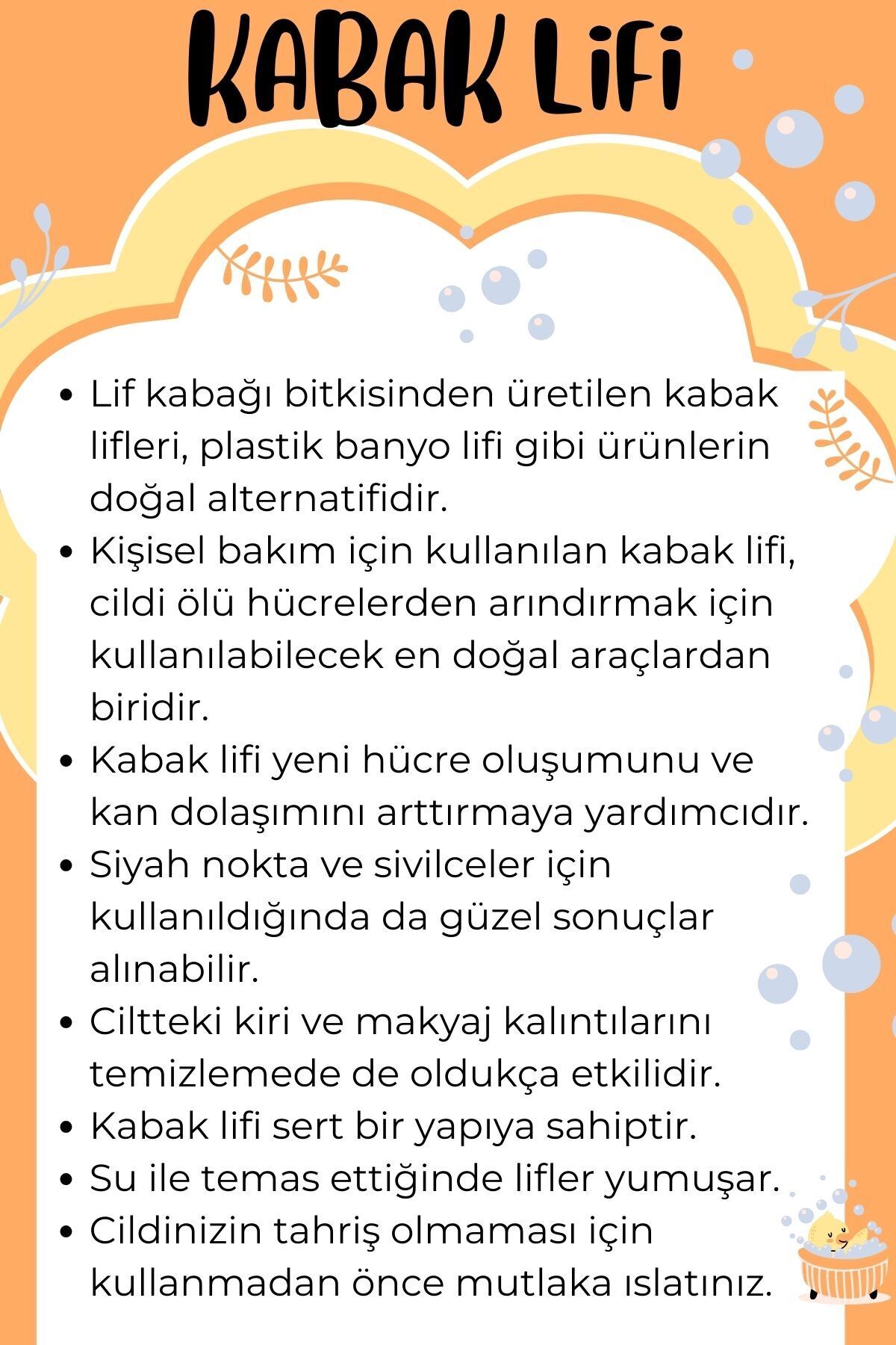 Lif kabağı bitkisinden üretilen kabak lifleri, plastik banyo lifi gibi ürünlerin doğal alternatifidir.; Kişisel bakım için kullanılan kabak lifi, cildi ölü hücrelerden arındırmak için kullanılabilecek en doğal araçlardan biridir.; Kabak lifi yeni hücre oluşumunu arttırmaya yardımcıdır. ; Siyah nokta ve sivilceler için kullanıldığında da güzel sonuçlar alınabilir.; Ciltteki kiri ve makyaj kalıntılarını temizlemede de oldukça etkilidir.; Kabak lifi sert bir yapıya sahiptir. ; Su ile temas ettiğinde lifler yumuşar.; Cildinizin tahriş olmaması için kullanmadan önce mutlaka ıslatınız.;