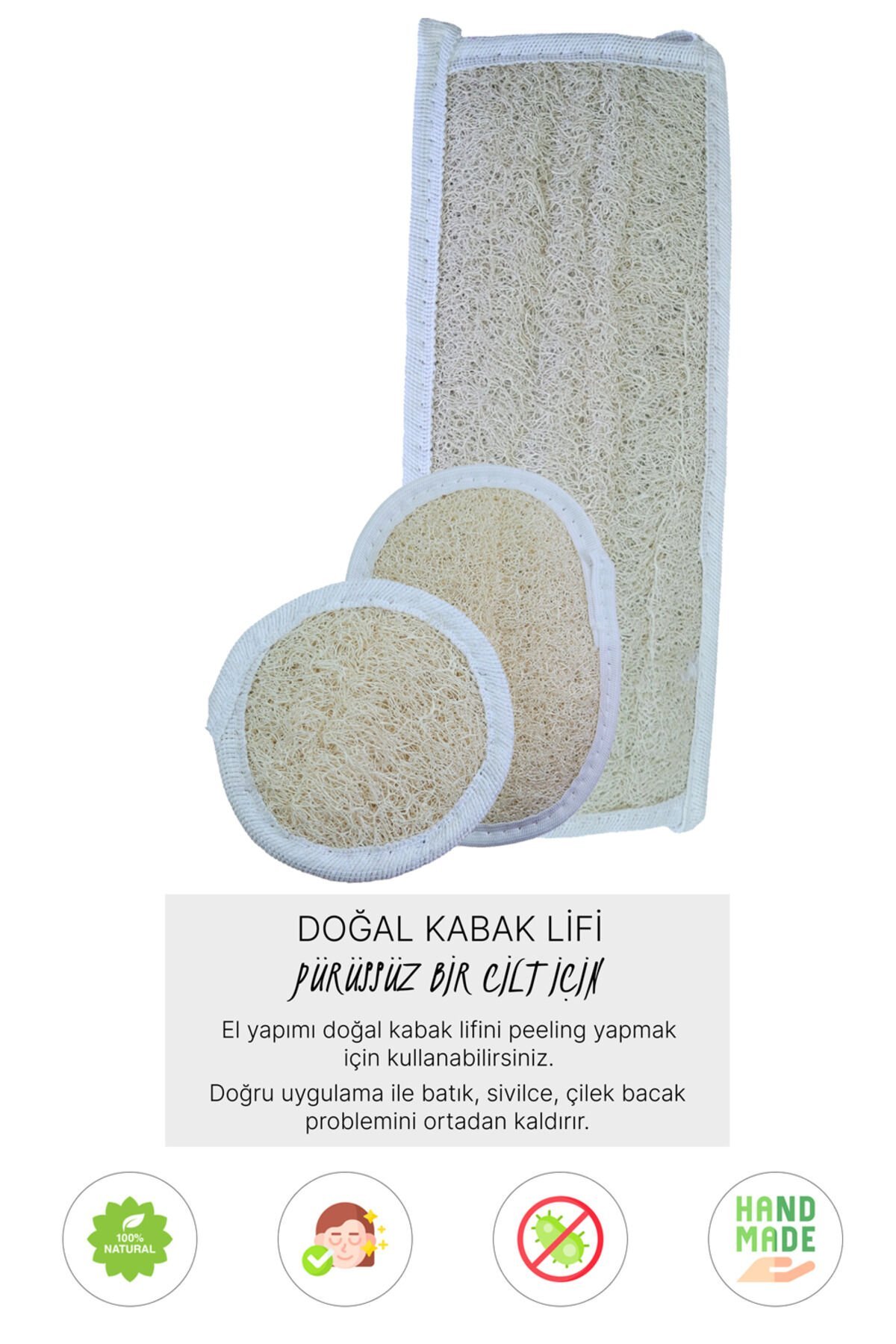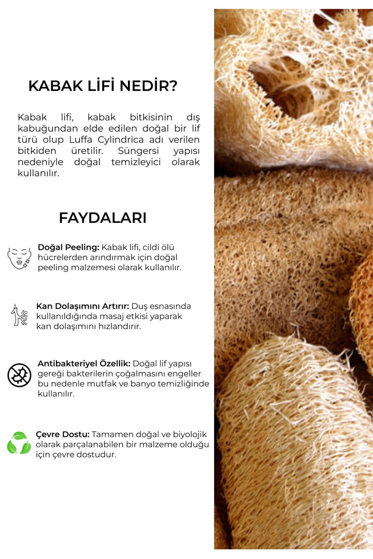 • Cildi Arındırır ve Ölü Derileri Temizler: Kabak lifi, cildi derinlemesine temizleyerek ölü deri hücrelerinin atılmasına yardımcı olur. Cildi yeniler ve pürüzsüz bir görünüm sağlar. • Kan Dolaşımını Artırır: Masaj yaparak kullanıldığında kan dolaşımını hızlandırır ve cilde canlılık kazandırır. • Selülit Görünümünü Azaltmaya Yardımcı Olur: Düzenli kullanımda, selülit görünümünü hafifletir ve cilt dokusunun sıkılaşmasına destek olur. • Doğal ve Kimyasal İçermez: Kabak lifleri tamamen doğal olduğu için ciltte kimyasal bir kalıntı bırakmaz, doğaya ve cilde dosttur. • Gözenekleri Açar: Gözenekleri temizleyerek cildin nefes almasını sağlar ve akne oluşumunu azaltmaya yardımcı olur. • Sürdürülebilir ve Çevre Dostu: Tekrar kullanılabilir ve biyolojik olarak doğada çözünebilir, çevreye zarar vermez. • Stokta olan renk gönderilir.