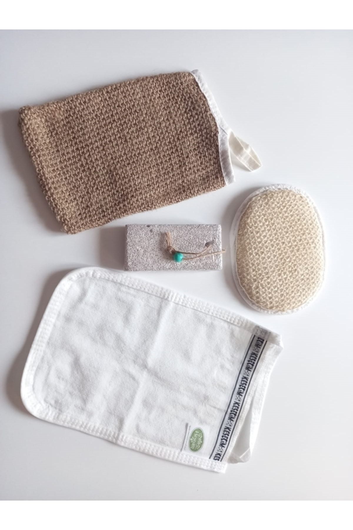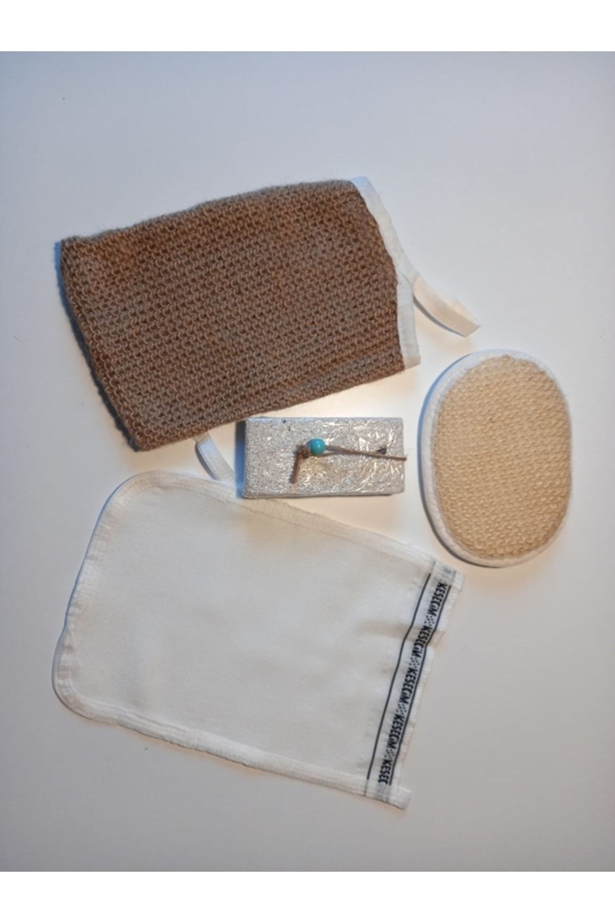 Doğal Keten Banyo Vücut Lifi, Doğal Yüz Lifi, Kesecim Kese Ve Topuk Taşı 4'lü Hamam Banyo Set