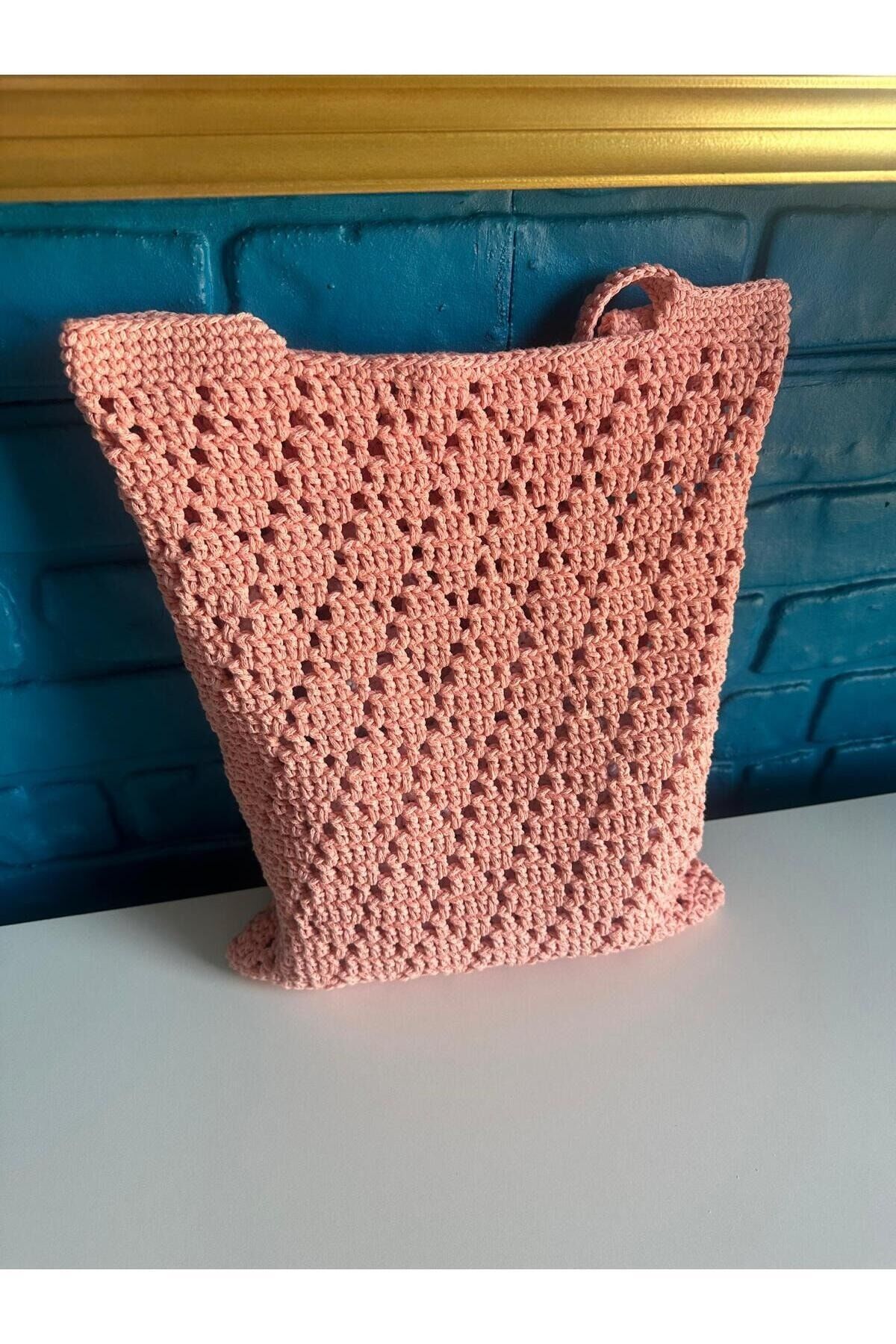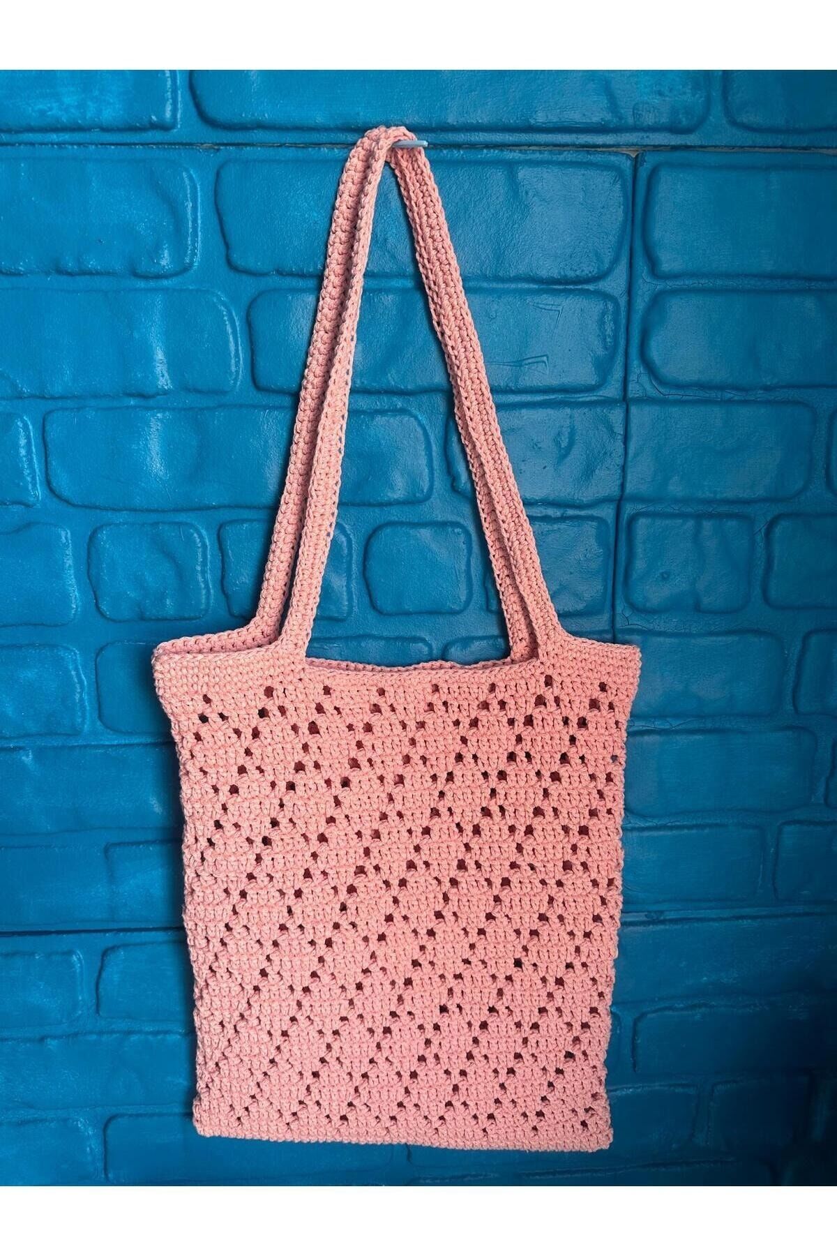 El İşi El Örgüsü Pembe File Çanta %100 Pamuk Makrome İpten Oval Tabanlı 30x35