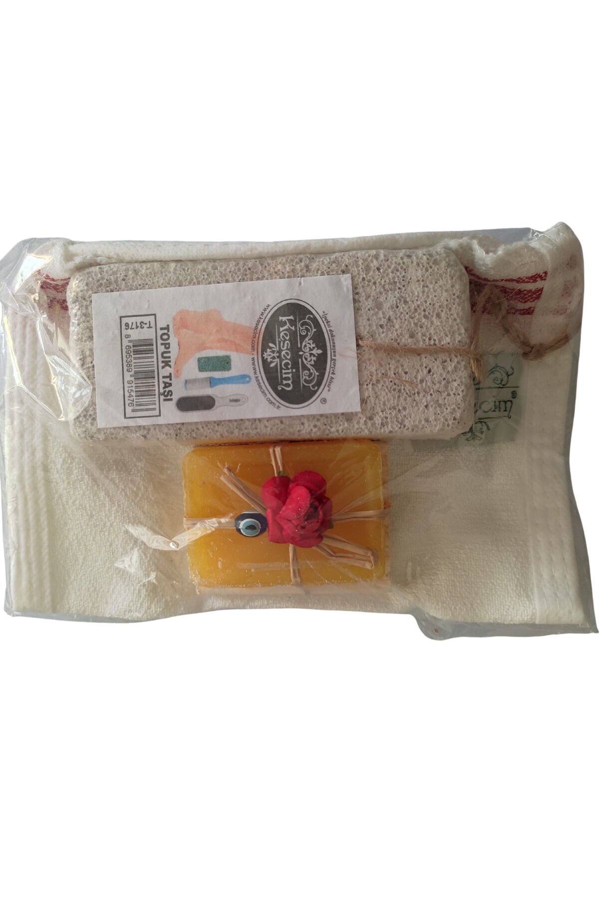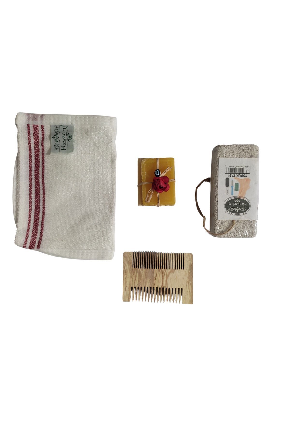 El Yapımı Ahşap Dekoratif Hediyelik Nazar Boncuklu Sabun Seti , Kese , Şimşir Tarak , Topuk taşı