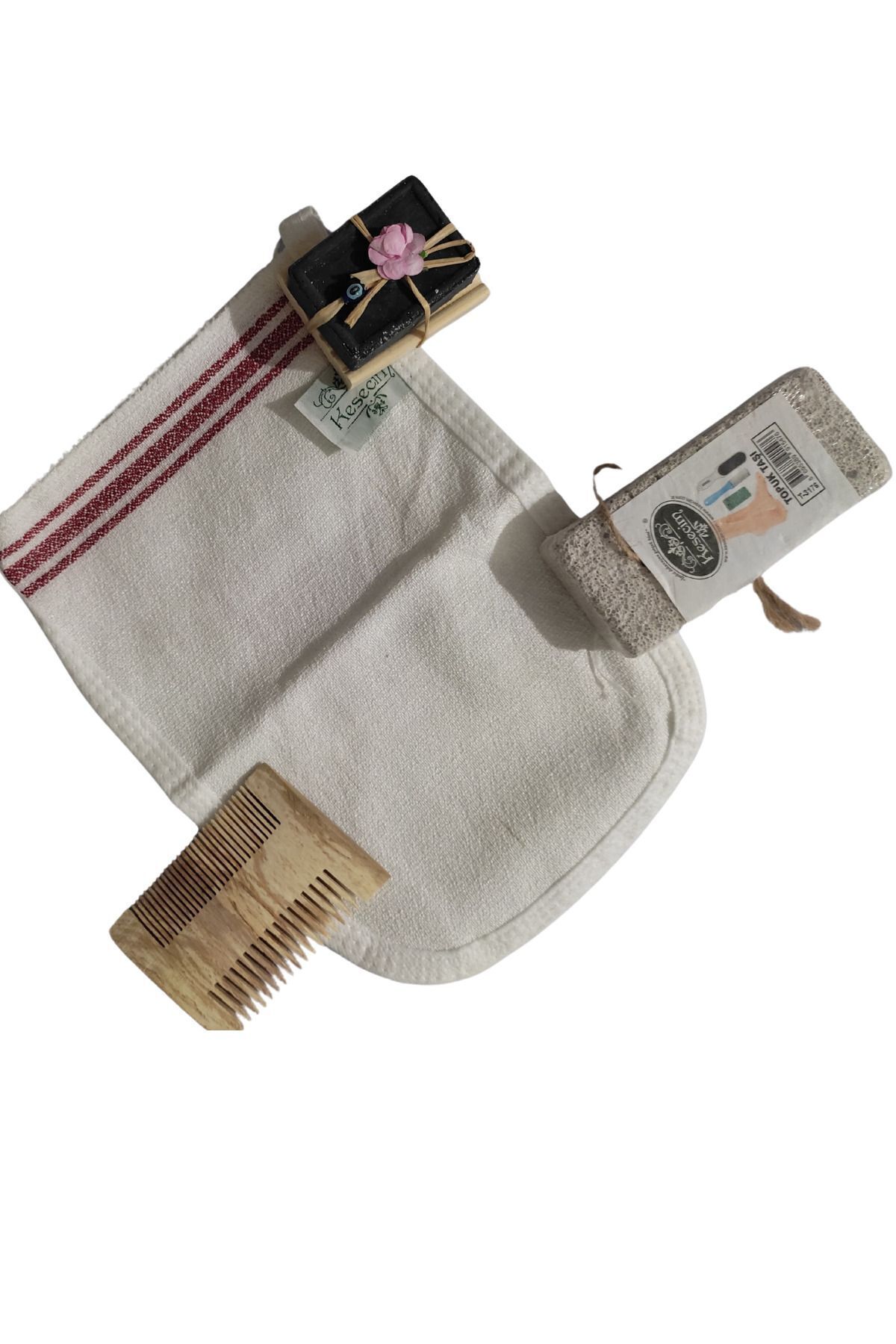El Yapımı Ahşap Dekoratif Hediyelik Nazar Boncuklu Sabun Seti , Kese , Şimşir Tarak , Topuk taşı