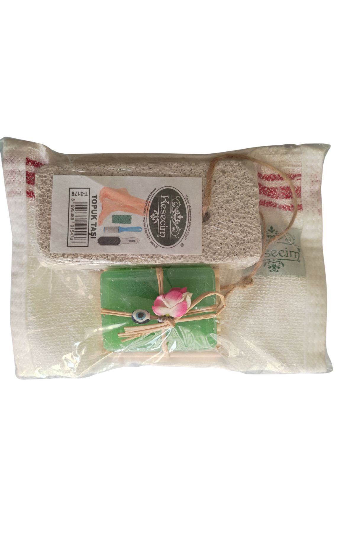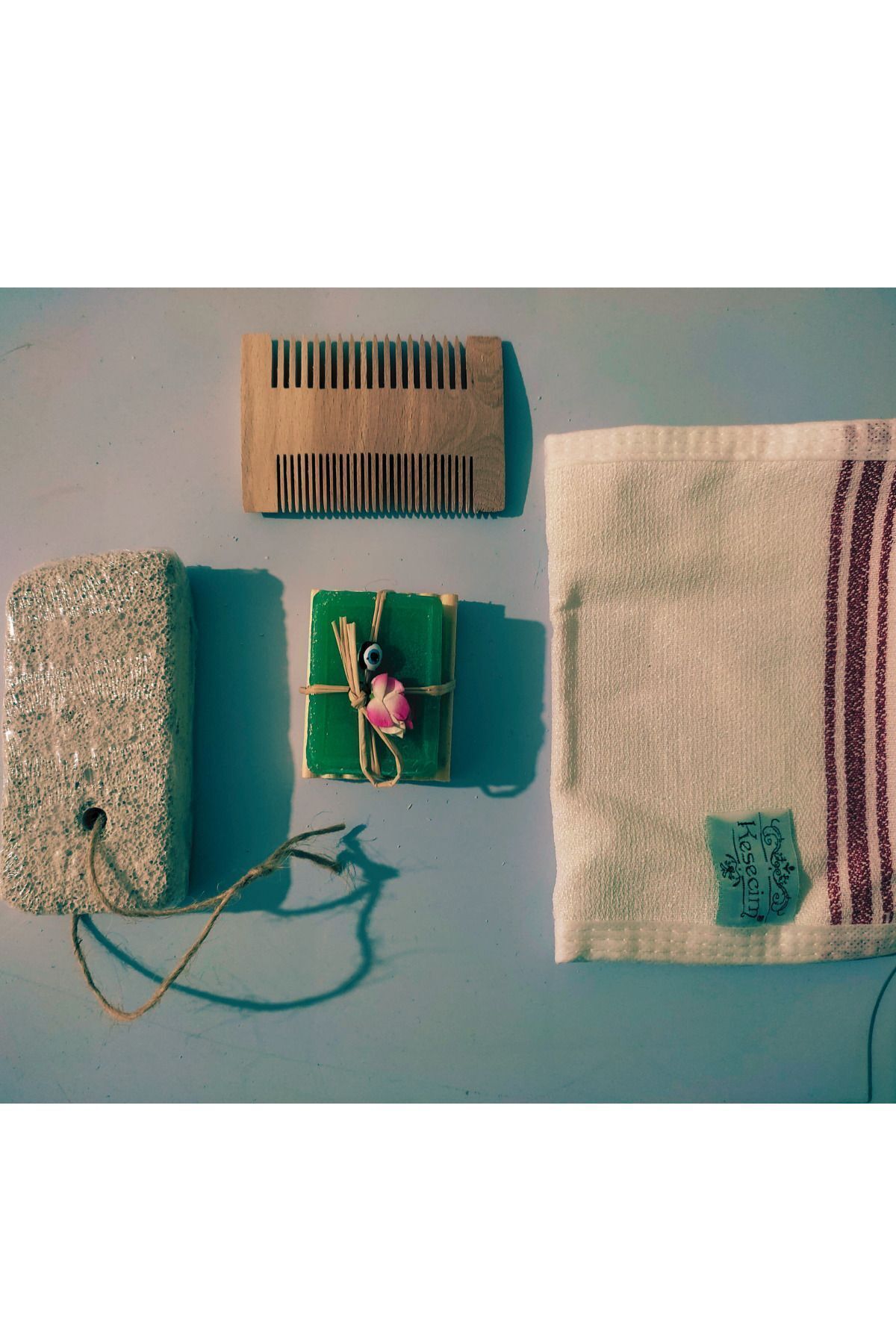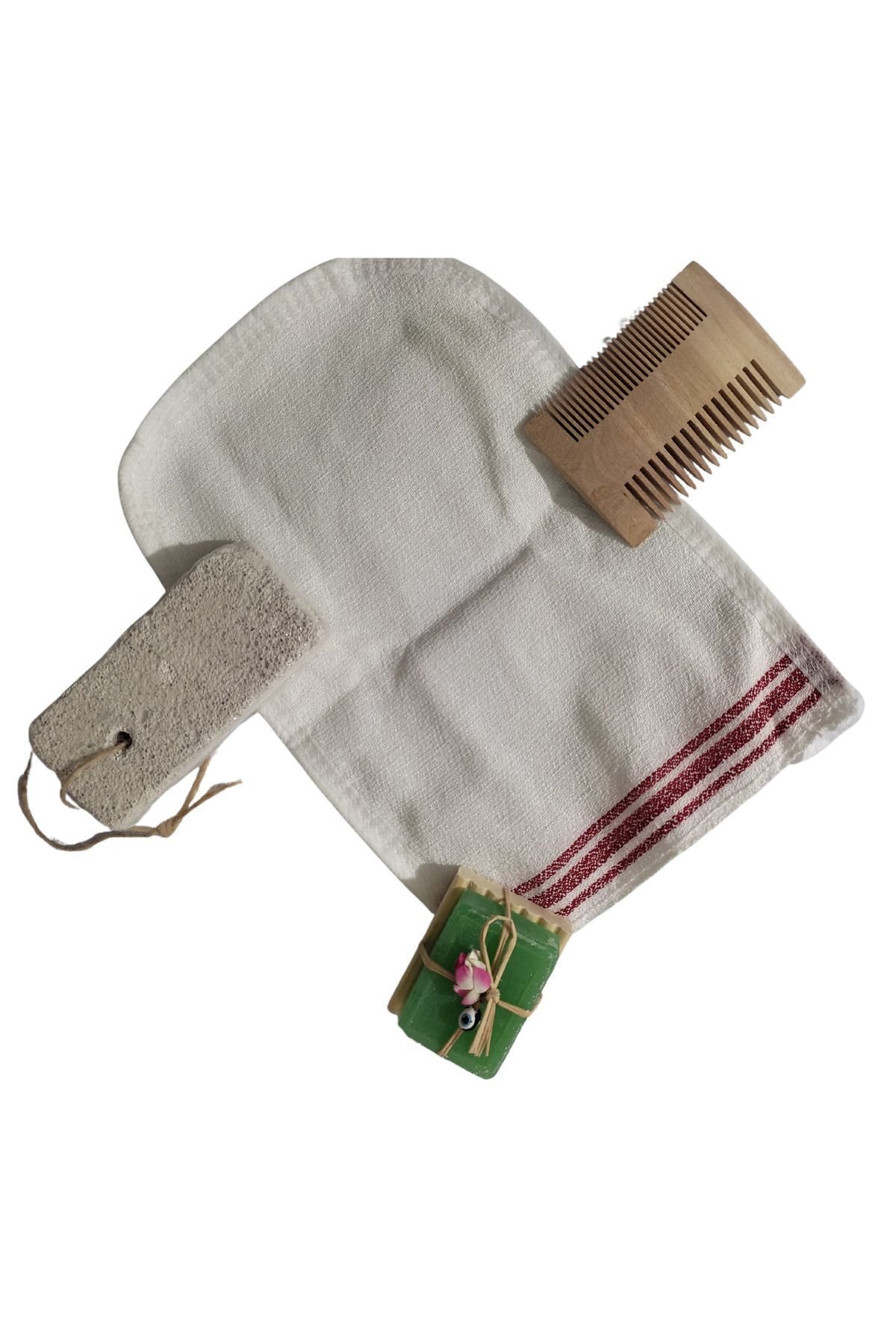 El Yapımı Ahşap Dekoratif Hediyelik Nazar Boncuklu Sabun Seti , Kese , Şimşir Tarak , Topuk taşı