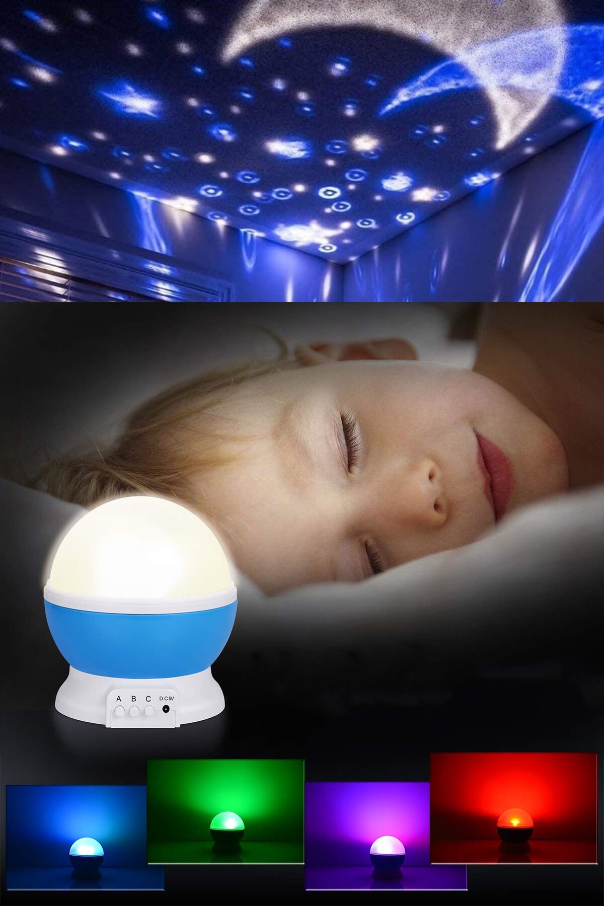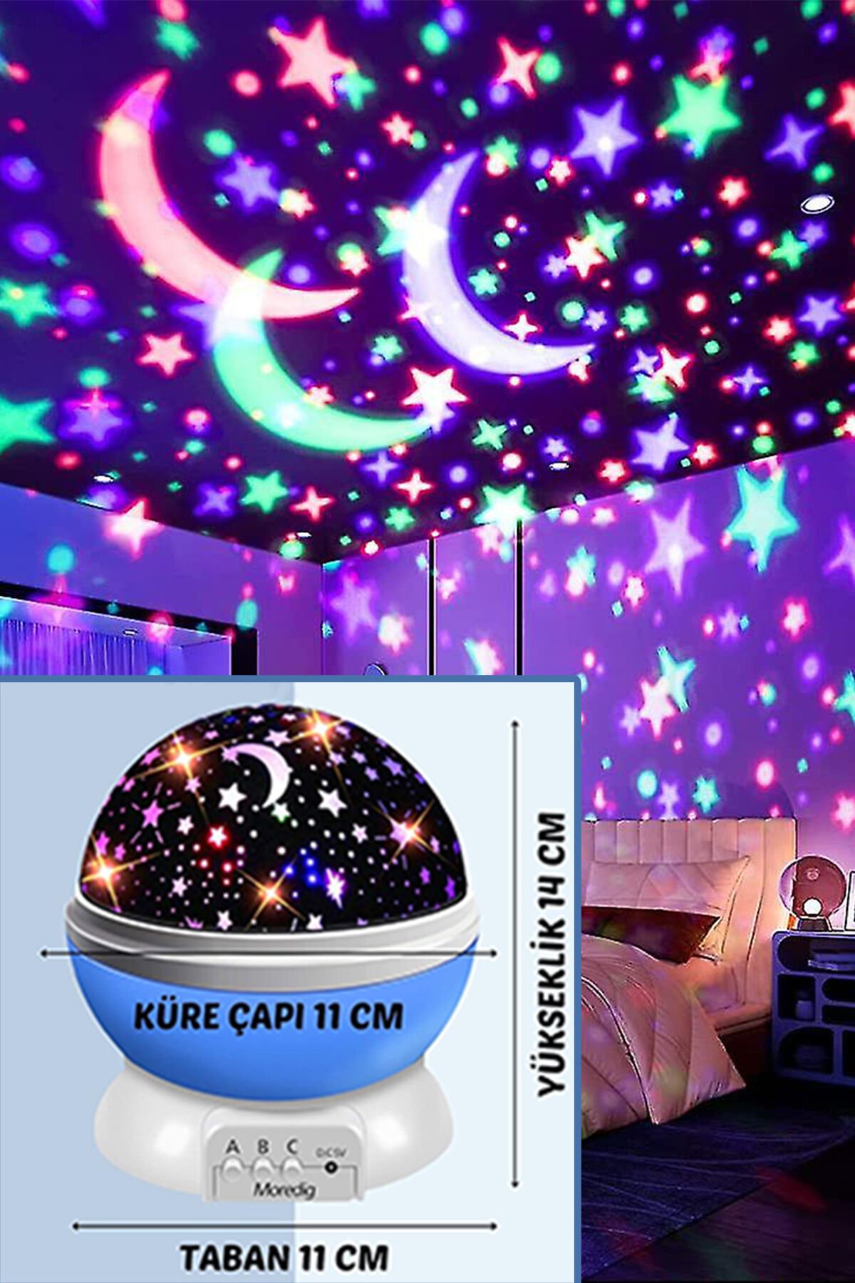 Çok renkli yanan ve dönebilen başlıklı projektör gece lambası ile siz de çocuğunuzun (ya da içindeki çocuğu öldürmeyen büyüklerin) odalarını aydınlatma dönme özelliği mevcuttur.; İster dönsün ister sabit dursun yansıtması tüm odayı kapsar, loş bir ortam oluşur.; Biri gün ışığı rente yansıtır, ikincisi renkli ışık yansıtır.; Her bastığınızda renk değiştirir.; Üçüncü tuş dönme özelliğini açıp kapatır.; Renkli yansıtma tuşu 8 farklı ışık modunda yansıtmaktadır.; Kalem pille çalışmaktadır Çocuklarınızın uyumasını kolaylaştırır.; Döner yapısı sayesinde odanızı aydınlatır.; 4 adet AA pil veya içerisinde bulunan USB kablo ile çalışır.; Açma kapama butonu bulunmaktadır.; PİLLER DAHİL DEĞİLDİR!