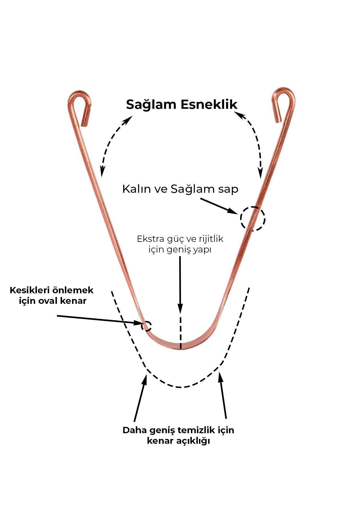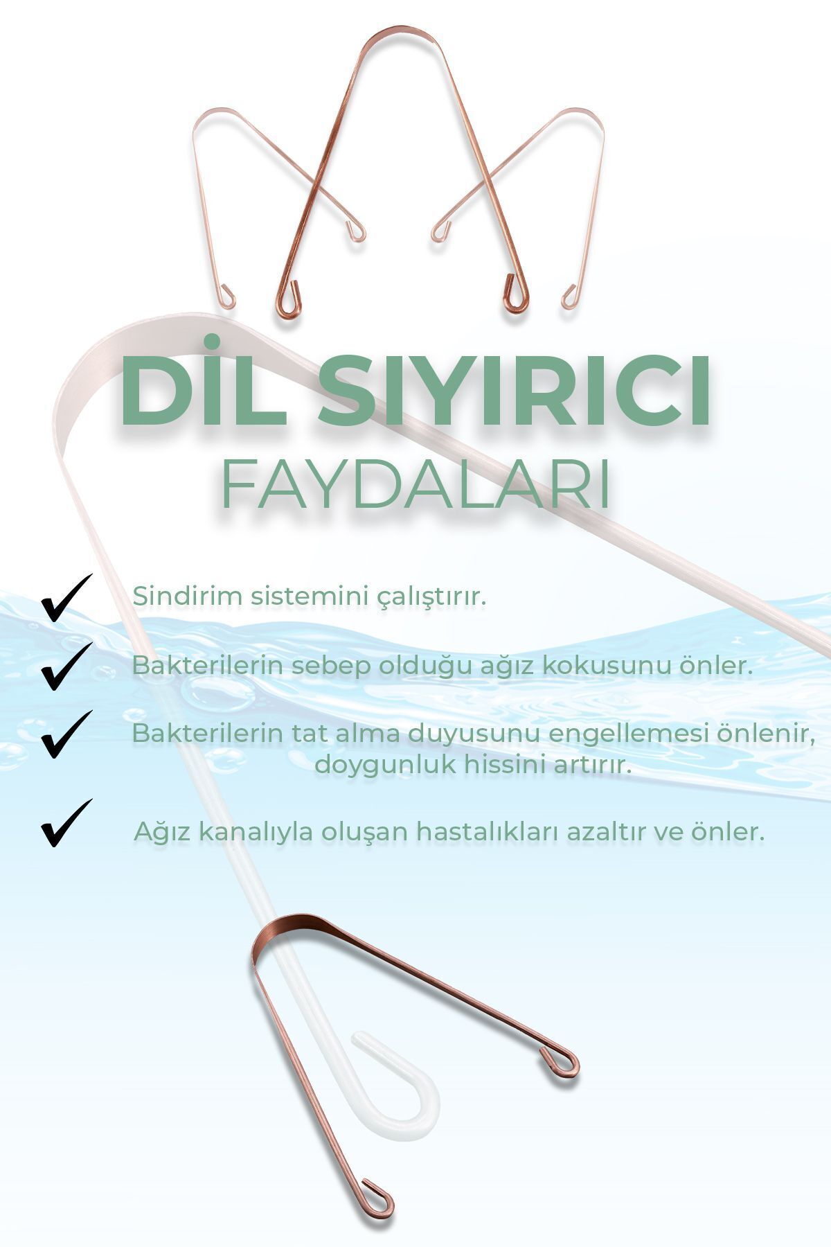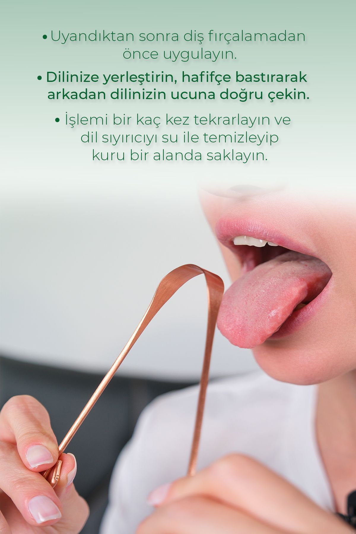 1.Bakır Dil Sıyırıcı Dil Temizleyici ve Dil Kazıyıcı Temizleme Aparatı •Hijyenik bakır dil sıyırıcı •Ağız bakımı için etkili •Paslanmaz ve dayanıklı Saf Bakır dil sıyırıcı aparatın yararları : Bakteri öldürücü yönü ilen onaylanan bakır madeninden imal sıyırıcı ile dil üzerinde bulunan plaklar temizlenir. Bu işlem ağız diş sağlığı , bağışıklığı kuvvetlendirme ve ağız kokusunu önlemede fayda sağlar. Özellikle gece uykusu esnasında ,dil üzerinde pek çok toksin birikir .Sabah uyandığınızda ağzınızda beliren acı tat , bu toksinlerin işaretidir. Sabah rutinine eklediğiniz dil sıyırma işlemi ile , bu toksinlerin vücuda geri alımını engelleyebilirsiniz. Bu işlem özellikle hiçbir şey yiyip içmeden önce yapılmalıdır. Dil sıyırma aparatı nasıl kullanılır ? Dil toksin sıyırıcı , temizleme aparatı kullanım aşamaları •Dil temizleyici aparatı su ile ıslatın . •Dilinizi dışarıya çıkarın ve dil temizleyiciyi dilinizin üst kısmına yerleştirin •Hafifçe bastırarak dil temizleyiciyi arkadan öne doğru sıyırın . •İlk sıyırma işleminden sonra aparatı durulayın ve ikinci aşamaya geçebilirsiniz . •İkinci aşamada, sıyırma işlemine dilin ortasından başlanır ve birkaç kez tekrarlanır •Kullanım esnasında sert uygulama yapılmamalı ; dilin zedelenmemesine dikkat edilmelidir •Kullanımdan sonra dil temizleyiciyi temizleyip saklayabilirsiniz •Ürün %100 bakır malzemeden imal edilmiştir. Ürünün temizliği belli aralıklarla ; karbonat ve limonla veya tuz ve limonla ovularak yapılmalıdır . İyice durulandıktan sonra , nemsiz bir kutuda muhafaza edilerek saklanmalıdır.