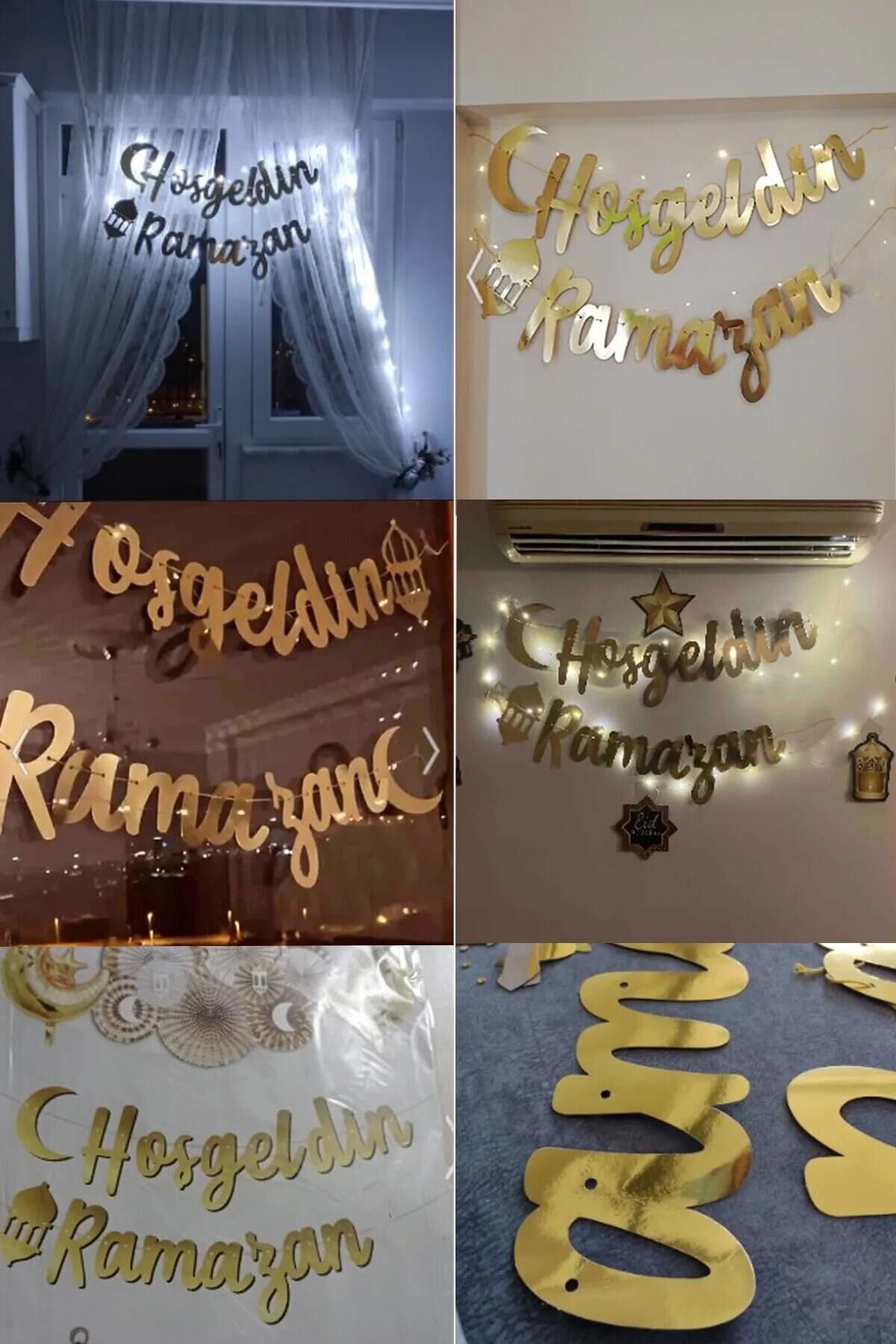 Hoşgeldin Ramazan Yazılı Kaligrafi Banner Gold 200x30cm Ramazan Bayramı Altın Renginde Ipli Süs Yazı