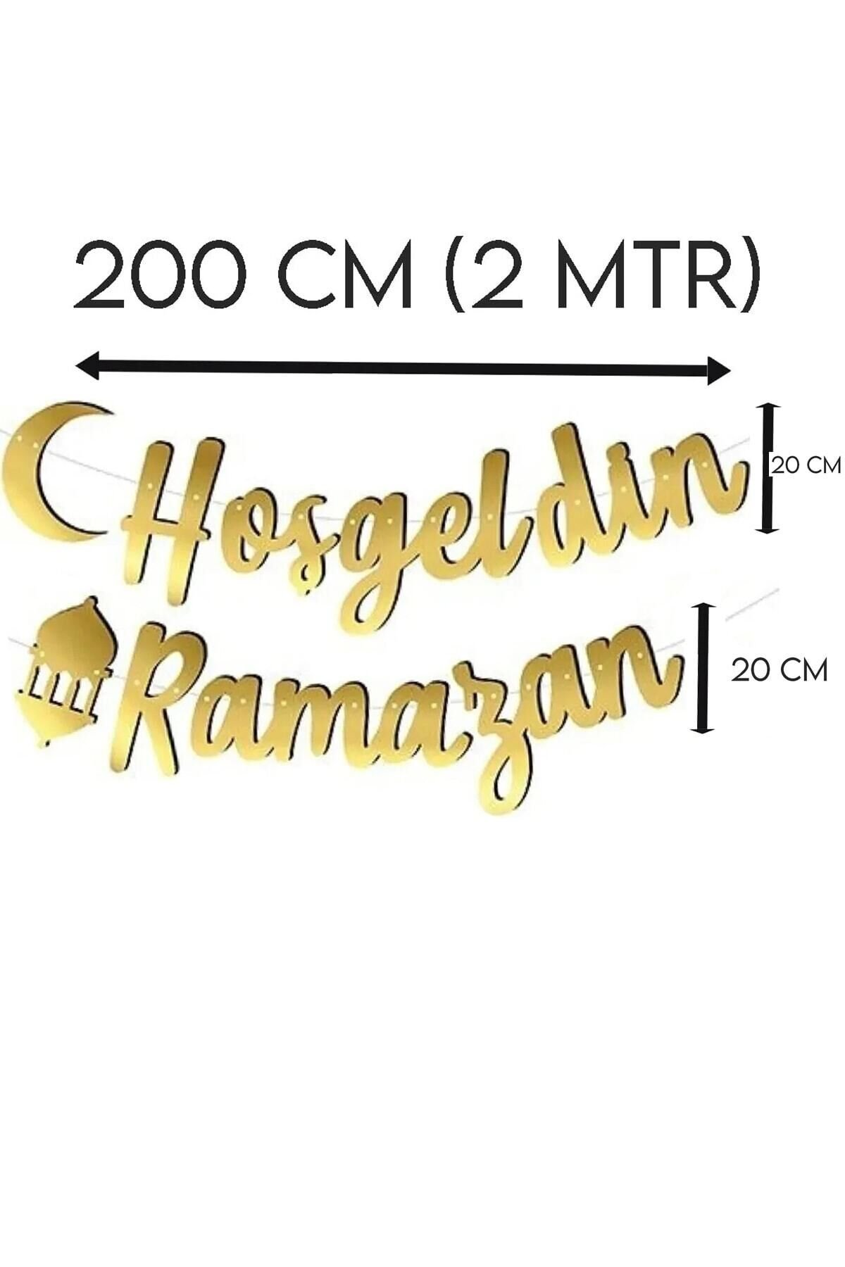 Paket içerisinde 1 set Gold Hoşgeldin Ramazan yazısı bulunmaktadır.; ; Yazının uzun kenarı 200cm dir Harflerin yüksekliği:20cm dir.; ; Hoşgeldin Ramazan yan yana olursa 200cm x 20cm görüntü elde edilir.; ; Hoşgeldin ve Ramazan kat kat 2 kat yazı olarak yapılırsa 100cm x 40cm bir görüntü elde edilir.; ; İpiyle birlikte gönderilmektedir.; ; 1.sınıf kağıda metalizeli olup barkodlu kutu ile paketlenmiştir.; ;