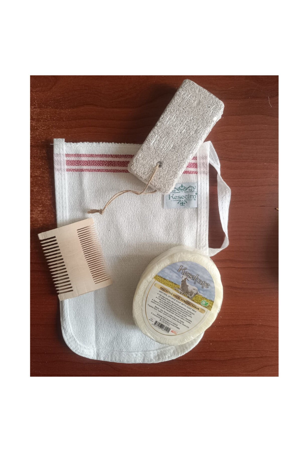 Keçi Sütlü Doğal Süngerli Sabun, Kese,şimşir Tarak, Ponza Topuk Taşı 4'lü Hijyenik Set