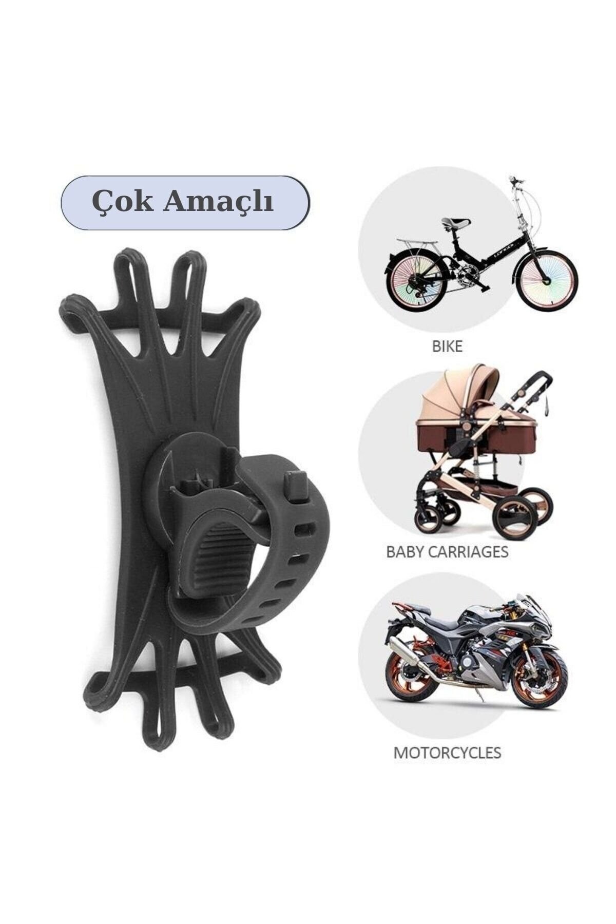 Dikkat: Telefonunuzu aparata dikkatle ve özenle sabitleyiniz.; Bisiklet gibi kara araçlarının sürüşü sırasında dikkatinizi yola veriniz.; Tüm telefon modelleriyle uyum sağlayabilen bir telefon tutucusu.; Bisiklet, motosiklet, bebek arabası, alışveriş arabası gibi çeşitli yerlerde kullanılabilir.; Çok yönlü ve esnek yapısıyla kullanım kolaylığı sunar.; Esnek ve ayarlanabilir gidon yapısıyla farklı yerlere uyum sağlar.; 360 derece dönebilen yapısı sayesinde telefonun istenilen şekilde konumlandırılmasını sağlar.; Esnek silikon yapısıyla şokları emerek telefonun düşmesini engeller.; Yumuşak yapısıyla telefonunuza zarar vermez.; Telefon tutucusunu takması kolaydır.; Bisiklet sürerken, motosiklet kullanırken, bebek arabası sürerken, alışveriş yaparken veya masa üstünde telefonunuzu sabitlemek için kullanılabilir.; Universal Bisiklet Motosiklet Çocuk Arabası Silikon 360 Derece Telefon Tutucu Tüm Modellerle Uygun