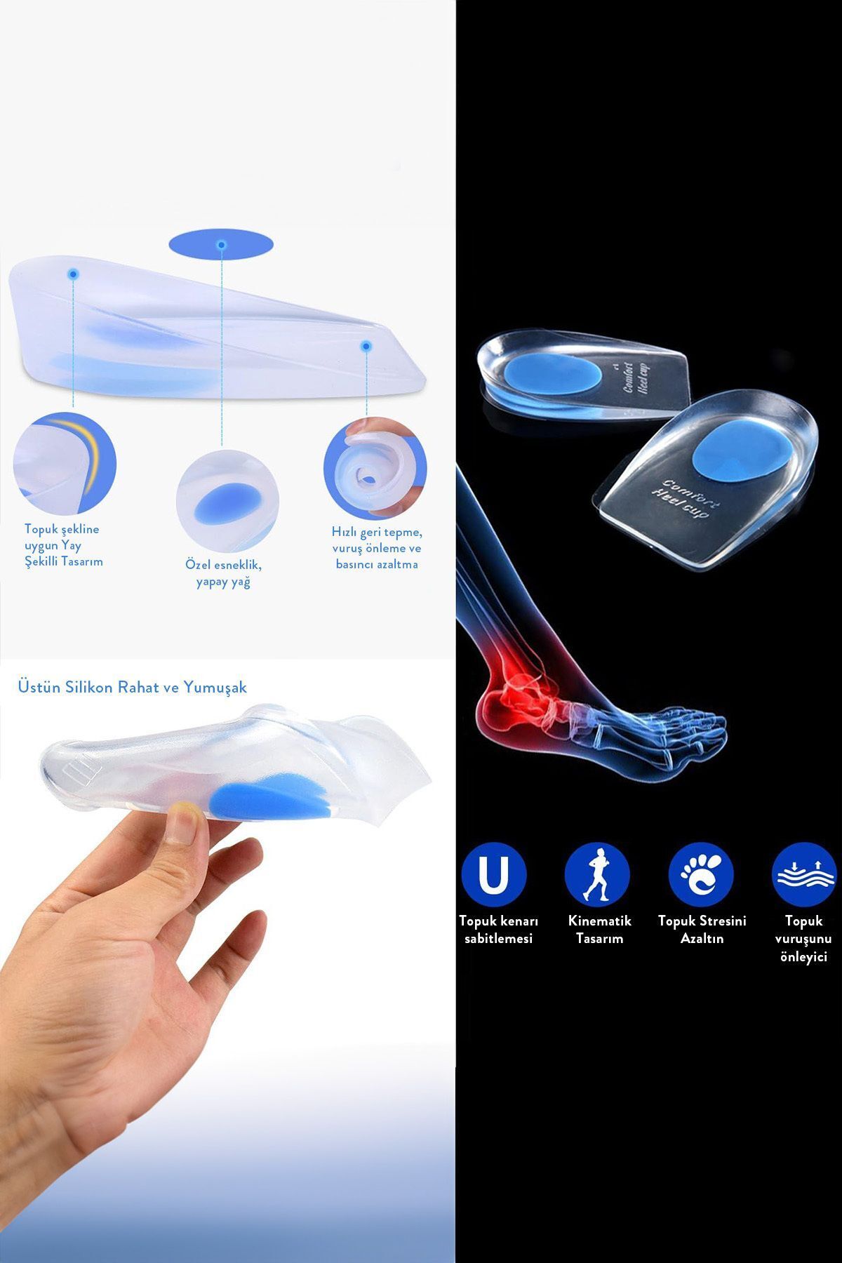 Şeffaf topuk dikeni yastığı tabanlık Ayak tabanı rahatsızlıklarında kullanacağınız silikon yastık! Özelikle topuk dikeni rahatsızlığı bulunanların kullanması gereken bir üründür. ; Elastik yapıya sahip tabanlık yürüme ve ayakta durma pozisyonlarında temel basınç noktalarına sahiptir. ; Iki farklı yoğunluğa sahip tabanlığın mavi bölgelerinde kullanılan silikon diğer bölgelerden daha yumuşaktır. ; Farklı yoğunluğu sayesinde basıncı ayağın anatomisine adapte ederek dengeli bir şekilde dağıtır. ; Rahatlatıcı ve dinlendirici yapısıyla silikon tabanlıklar birçok rahatsızlığın tedavisinde kullanılabilir. ; Tek bir hasta sınırlama olmaksızın kullanabilir. ; Sabun kullanmadan ılık su ile temizleyebilirsiniz. ; Tüm ayak tiplerine uyumludur. ; Not : Ürün standart bedendir Paket içeriği: 1 çift şeffaf topuk dikeni tabanlık;