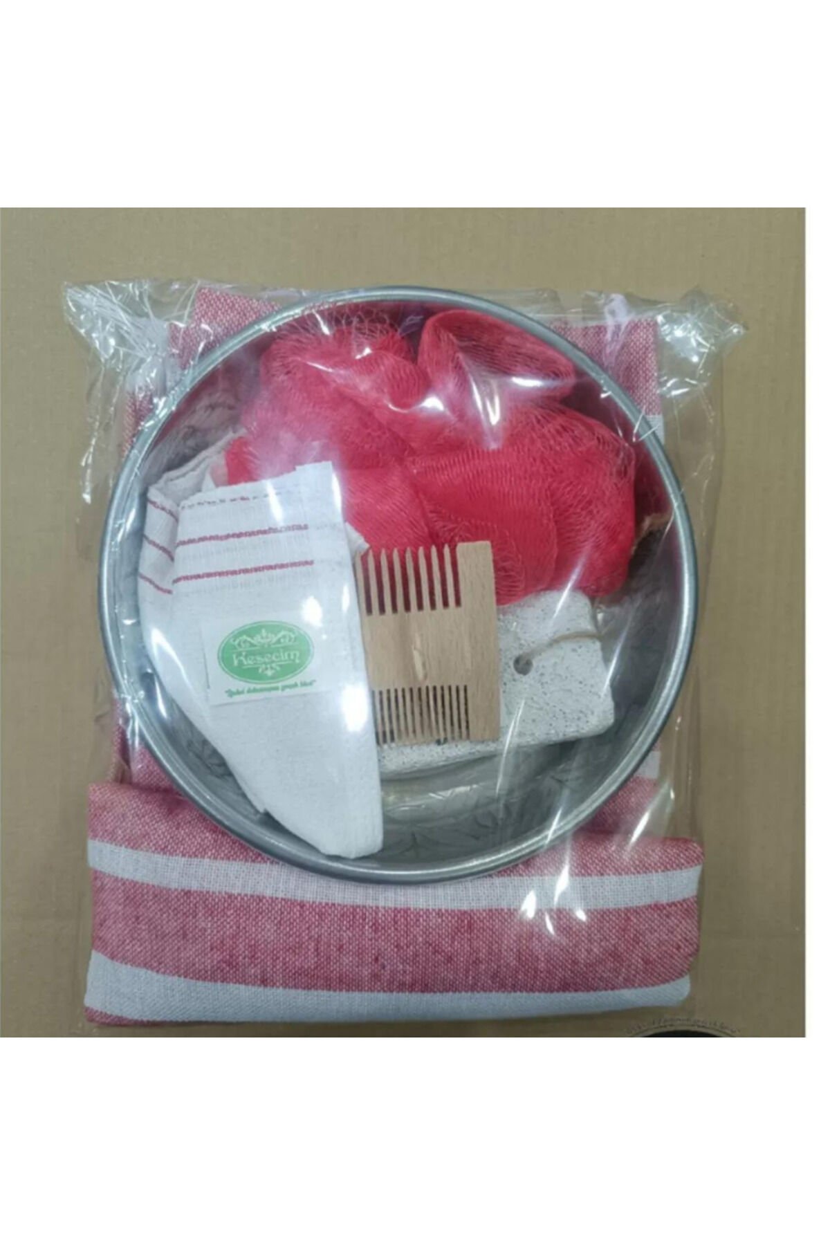 Peştemal 70x130, Alüminyum Hamam Tası, Kese,Banyo Lifi,Ahşap Tarak,Topuk Taşı 6'lı Hamam Set