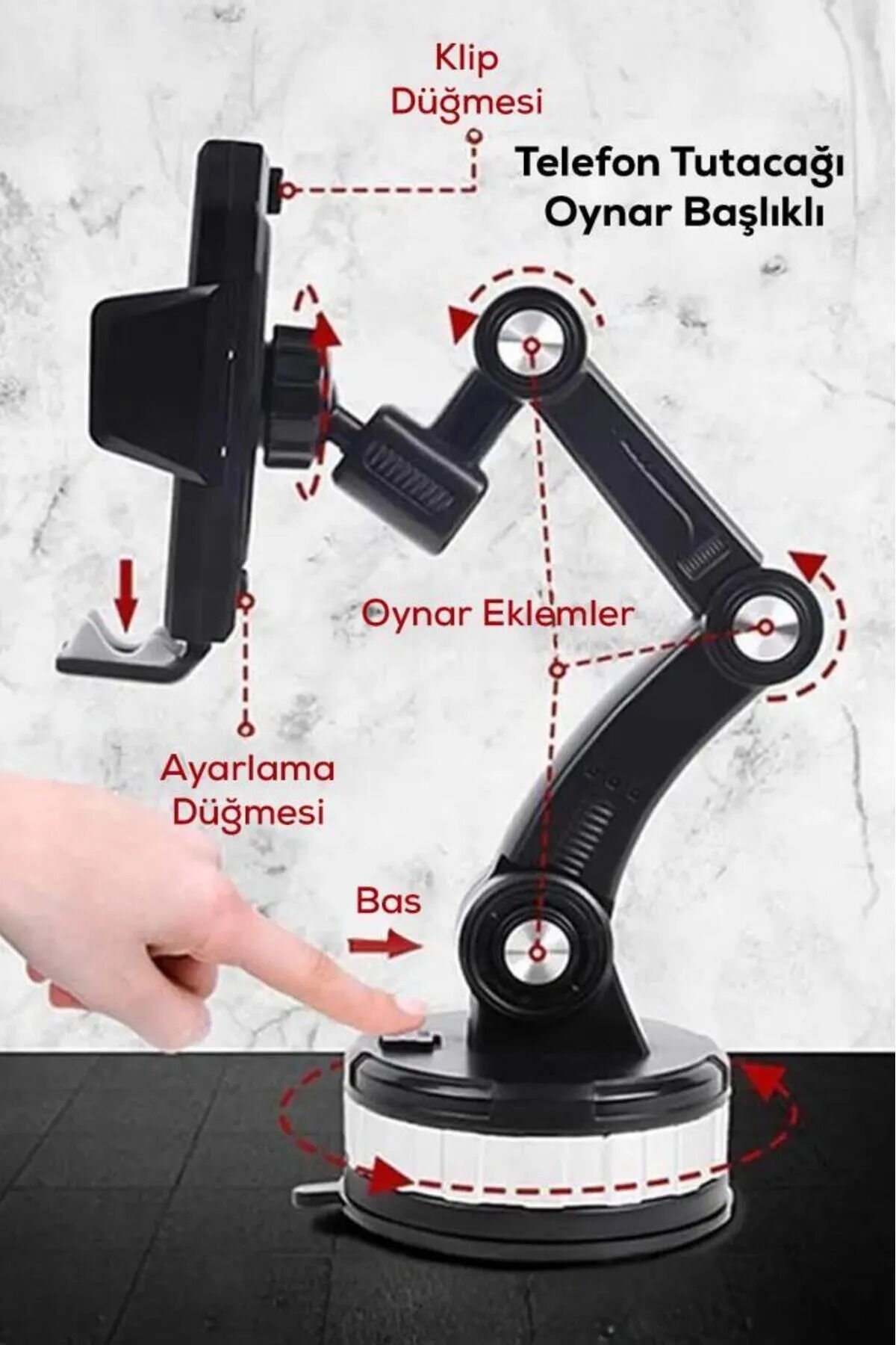 - Yüksek kaliteli plastik malzemeden üretilmiş olup, uzun süreli kullanım için dayanıklılık sunar.; - Robotik teknolojisi sayesinde 360 derece dönebilme özelliği ile telefonunuzu istediğiniz açıda sabitleyebilirsiniz.; - Akrobat yapısı, farklı boyutlardaki araçlara kolayca uyum sağlayarak pratik bir kullanım imkanı tanır.; - Vantuzlu tasarımı sayesinde aracınızın iç yüzeyine güvenle tutunurken ekstra aksesuar ihtiyacını ortadan kaldırır
