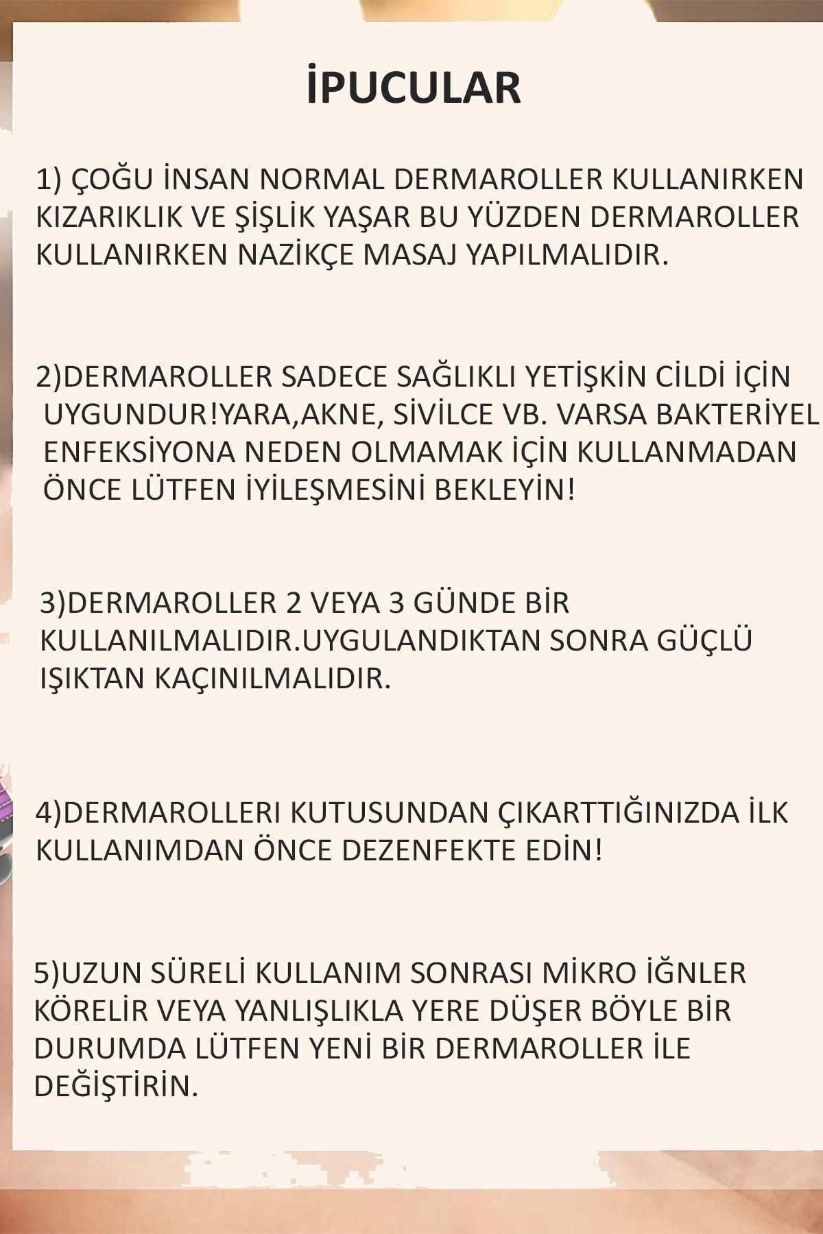 Sadece kişisel kullanım içindir. ; - Başka biri ile paylaşmayınız. ; - Alerjik yapısı olanlar doktora danışmalıdır. ; - Dermaroller çok geniş uygulama alanına sahiptir. ; - Bunların başında anti-Aging uygulaması ile cildin yeniden yapılandırılması, kırışıklık çizgilerinin giderilmesi, güneşin verdiği hasarın azaltılması gelmektedir. ; - Ayrıca yara ve yanık izleri, cilt çatlakları, akne izleri gibi önemli sorunlarda da etkin kullanımı mevcuttur. ; - Melazma ve hiperpigmentasyon gibi cilt lekesi sorunlarında, derideki geniş porlu yapının azaltılmasında tatmin edici sonuçlar vermektedir. ; - Saç dökülmesi de derma roller uygulamasının başarılı olduğu alanlardan biridir. ; - Saç bölgesinde, yanak ve alın gibi açık bölgelerde, göz altı morluklarında, yüzde kırışıklık ve boyun ile çene bölgelerinde sarkıklık giderme işlemlerinde kullanılabilir. ; - Uygulamada kullanılacak derma roller aparatının iğnelerinin çok düzgün ve simetrik olması, titanyum iğnelerden yapılmış olması, montajında yapıştırıcı kullanılmaması başarı için önemli faktörlerdir. ; - dermaroller titanyum 540 iğneli 0.5 mm üzerinde onlarca çok ince iğnelerin bulunduğu silindir şeklinde bir cihazdır. ; - Uygulamasının esası bu silindirin cilt üzerinde gezdirilerek binlerce mikro deliklerin açılması şeklinde olur. ; - Uygulama sırasında tedavi edici ürünler de kullanılarak, etkinin artması sağlanabilmektedir. ; - Açık yara bulunan ciltlerde kullanılmamalıdır.;