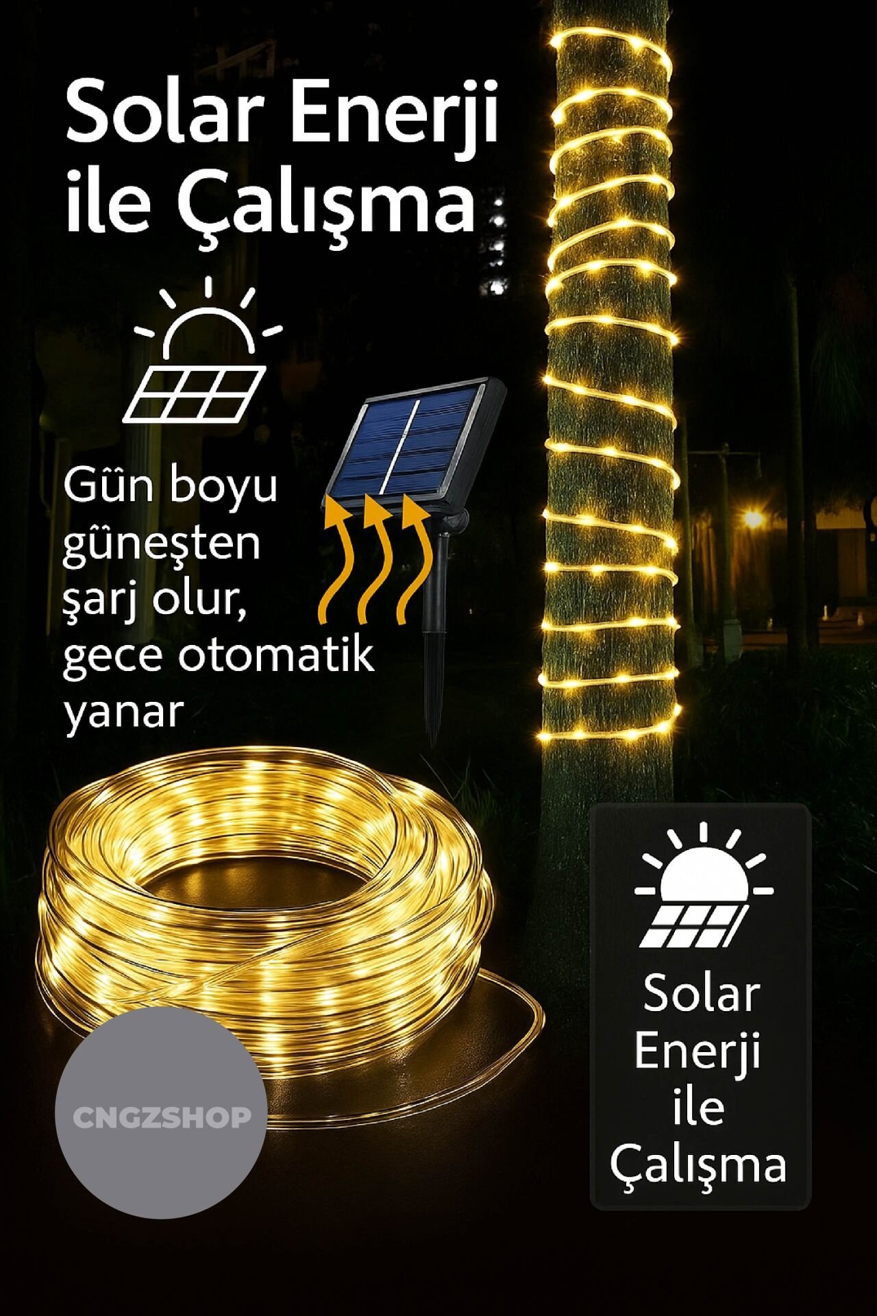 Solar Enerjili Neon LED Işık 10 Metre | Su Geçirmez Sarı Animasyonlu Bahçe, Balkon, Teras ve Ağaç Aydınlatması