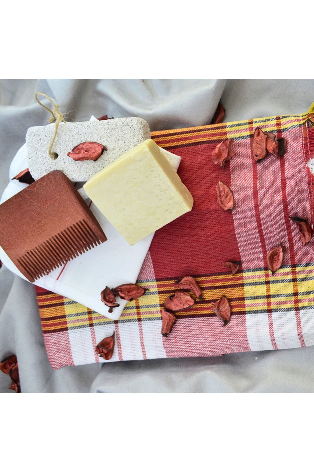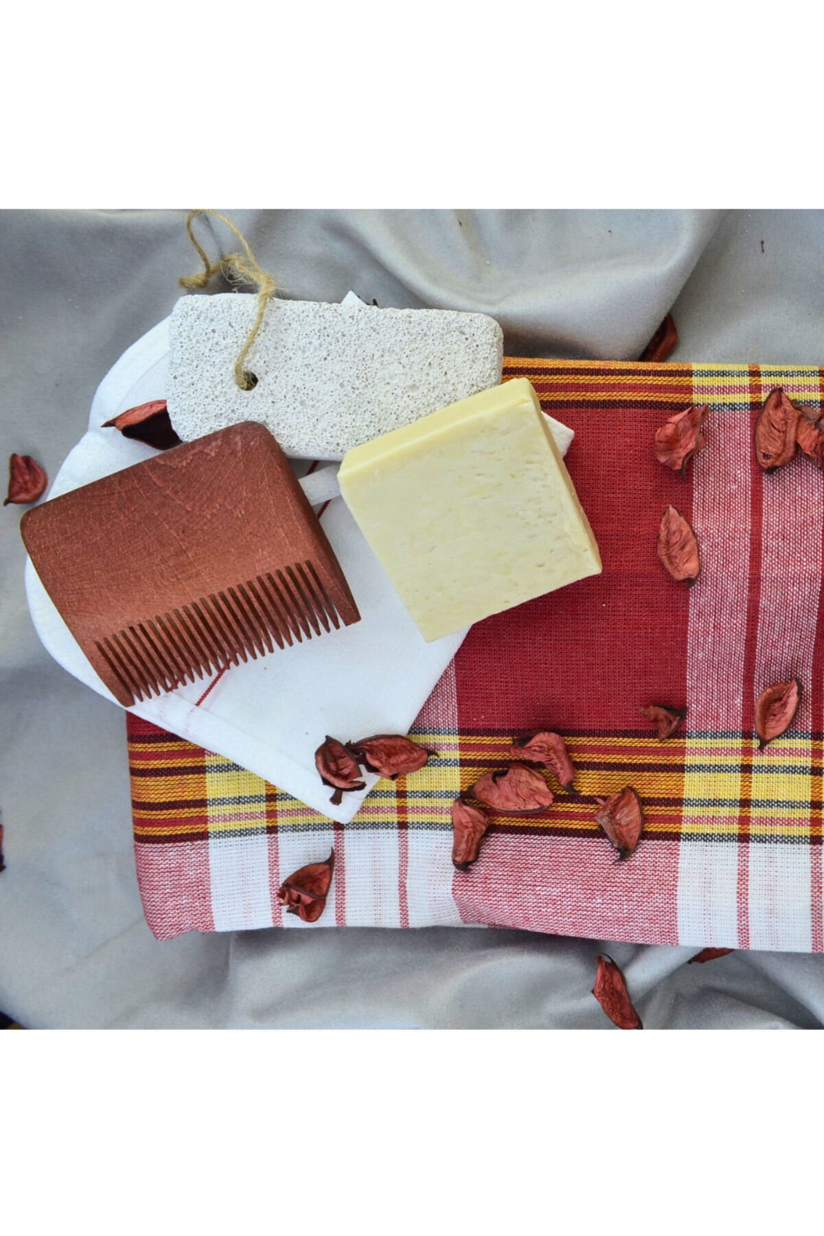 Hamam Seti: Geleneksel Rahatlama ve Şıklık Hamam deneyiminin keyfini evinize taşımanız için mükemmel bir fırsat sunuyoruz. Kadınlar ve erkekler için tasarlanmış bu özel hamam seti, geleneksel Türk hamamının tadını çıkarmak isteyen herkes için idealdir. İçeriğinde bulunan özenle seçilmiş ürünler, size sadece bir hamam değil, aynı zamanda lüks bir rahatlama deneyimi sunar. Set İçeriği: Tarak:Yüksek kaliteli ahşap malzemeden üretilmiş bu tarak, saç bakımınızı ve saç taramanızı kolaylaştırır. Kadınların uzun saçlarından erkeklerin kısa saçlarına kadar herkes için uygundur. Kese:Doğal pamuk ipliklerinden üretilmiş bu kese, cildinizi nazikçe temizler ve ölü deriyi arındırır. Geleneksel Türk hamamının olmazsa olmazlarından biri olan kese, cildinizi canlandırır. Peştemal: 70x180 cm boyutlarındaki bu hafif ve hızlı kuruyan peştemal, hem kadınlar hem de erkekler için mükemmel bir seçenektir. Duş sonrası veya hamam sonrası rahatlığı sunar. Sabun:Doğal ve el yapımı sabun, cildinizi temizlerken nemlendirir. Hamam deneyiminizin vazgeçilmez bir parçasıdır. Topuk Taşı:Özel olarak tasarlanmış doğal volkanik taştan üretilmiş olan topuk taşı, ayak tabanlarınıza ve topuklarınıza rahatlatıcı bir masaj yapar. Ayaklarınızın günün yorgunluğunu atmasına yardımcı olur. Bu özel hamam seti, hamamın geleneksel rahatlatıcı atmosferini evinize getiriyor ve size şıklık ve konfor sunuyor. Kendiniz veya sevdikleriniz için mükemmel bir hediye seçeneği olan bu set ile keyifli anlar yaşayabilirsiniz. Neden Biz? Yüksek Kalite: Ürünlerimiz yüksek kaliteli malzemelerden üretilir ve uzun ömürlüdür. ; Geleneksel Deneyim: Geleneksel Türk hamamı deneyimini evinize getirin. ; Hem Kadınlar Hem de Erkekler İçin: Setimiz hem kadınlar hem de erkekler için uygundur. ; El Yapımı Sabun: Doğal ve el yapımı sabun cildinizi nazikçe temizler. ; Hamam setimiz, sadece bir hamam deneyimi değil, aynı zamanda lüks bir rahatlama deneyimi sunar. Şimdi sipariş verin ve geleneksel hamam deneyiminin keyfini çıkarın!