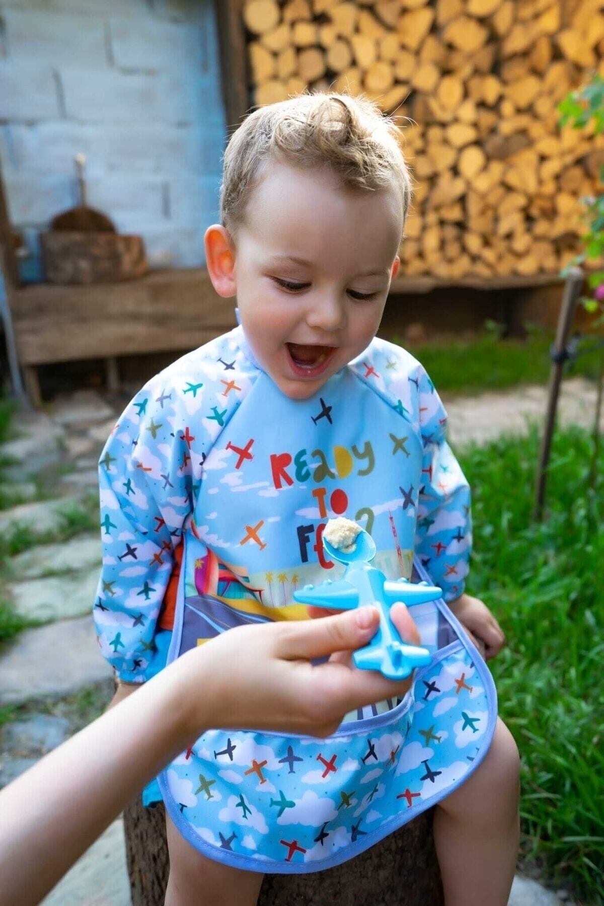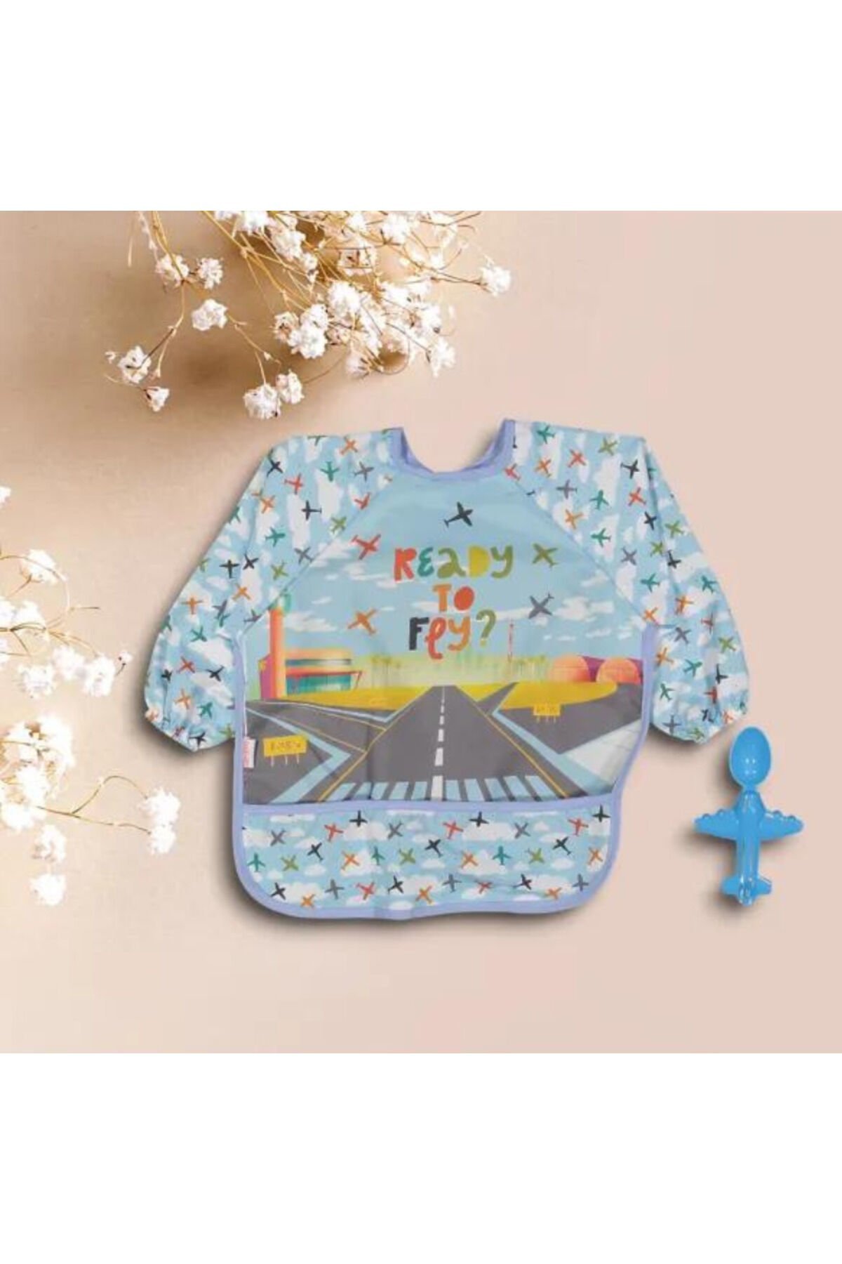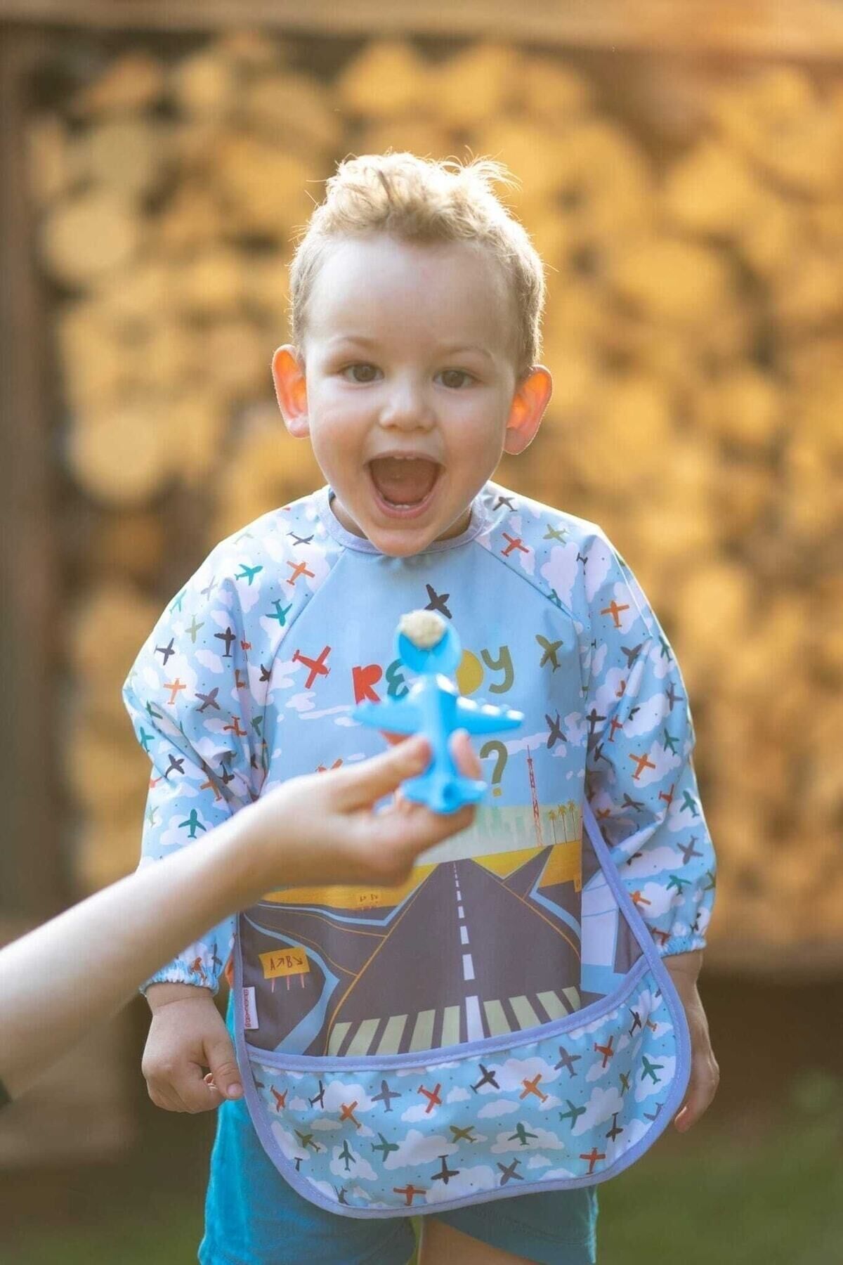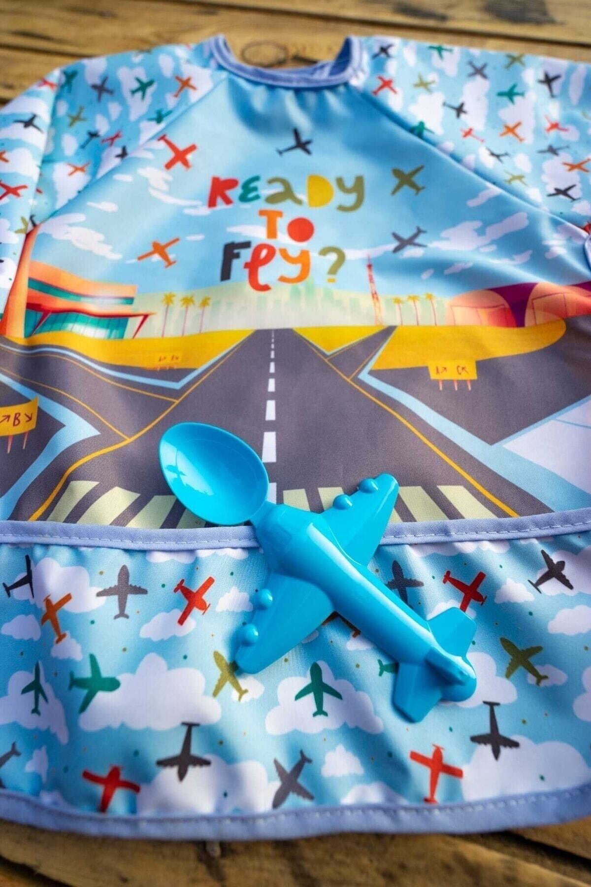 Uçak Geliyor Sıvı Geçirmez Mama Önlüğü Ve Mama Kaşığı 0-2 Yaş Unisex Mavi (kutuda)