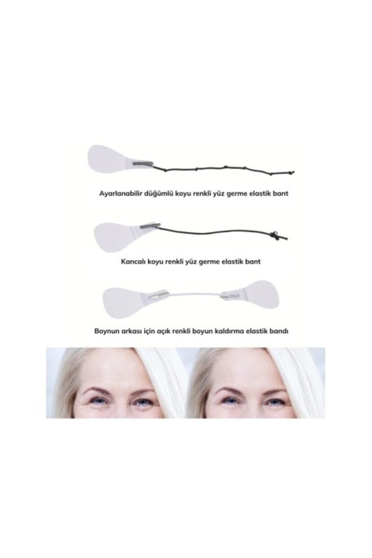 Lastikli Yüz Kaş Göz Boyun Gerdirme Bantları (40 Adet)Ürün Özellikleri:V Şekilli Bir Yüz için: Yüz germe pedleri, iyi esnekliğe sahip su geçirmezdir ve cildinizi rahatsız etmez. V şeklinde bir yüz oluşturmak için cildinizi kaldırabilir ve sıkılaştırabilir.Yumuşak ve Rahat: 40 adet hipoalerjenik yüz germe bantları vardır ve bunlar çevre dostu silikon kauçuk malzemelerden yapılmıştır, kullanımı güvenlidir, sağlıklı, yumuşak ve rahattır.Mükemmel Yüz Germe: Yüz ve boyun germe seti, gevşek cildi iyileştirir ve yüz, boyun, çene ve göz bölgesindeki kırışıklıkları ortadan kaldırır.Daha Genç Olun: Yüz germe bandı, sarkan yüz kaslarını germeye yardımcı ve yüzünüzü şekillendirmeye yardımcıdır. İlk kullanımla beraber daha genç görünecek ve harika hissedeceksiniz.Geniş Uygulamalar: Yüz germe bandı özel günler, düğünler, toplantılar, modellik, fotoğraf çekimi, seyahat vb. için idealdir. İnce, sıkı ve güzel bir yüzün şekillendirilmesine yardımcı olur.Malzeme: Silikon,kauçukRenk: şeffafPaket İçeriği:40 adet Yüz Germe Bandı ve Kademeli Uygulama Lastikleri